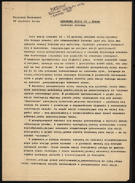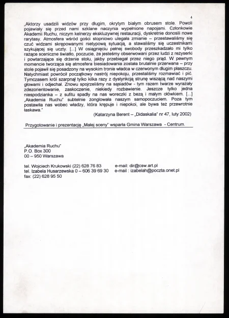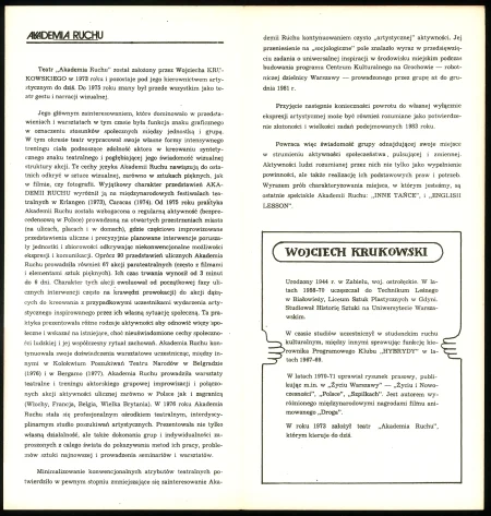 Akademia Ruchu to jeden z najważniejszych kolektywów twórczych działających w polu sztuk performatywnych w Polsce. Został założony w 1973 roku przez Wojciecha Krukowskiego. Akademia Ruchu definiowała się jako „teatr zachowań” i „teatr narracji wizualnej”. Była grupą twórczą działającą na pograniczu różnych dyscyplin – teatru, sztuk wizualnych, sztuki performance i filmu. Więcej