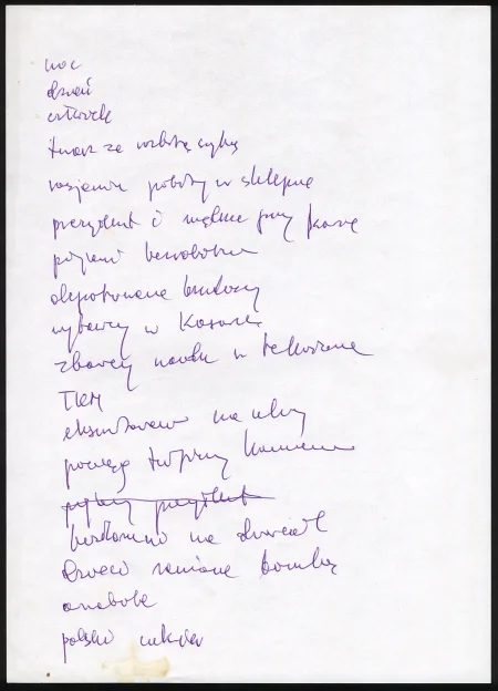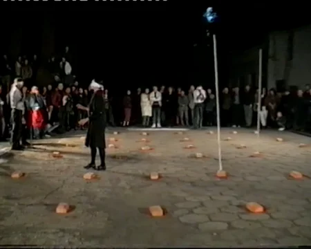 W pierwszej fazie spektaklu aktorzy wyznaczali pole akcji, a zarazem pozbawiali je, w sposób symboliczny, nawarstwień codzienności. Czyścili, „sterylizowali” wybrany fragment placu lub chodnika, przygotowując go w ten sposób do przyjęcia roli ołtarza ofiarnego, albo też czystej karty, na której za chwilę zostaną zapisane znaki uniwersalnego przesłania.
