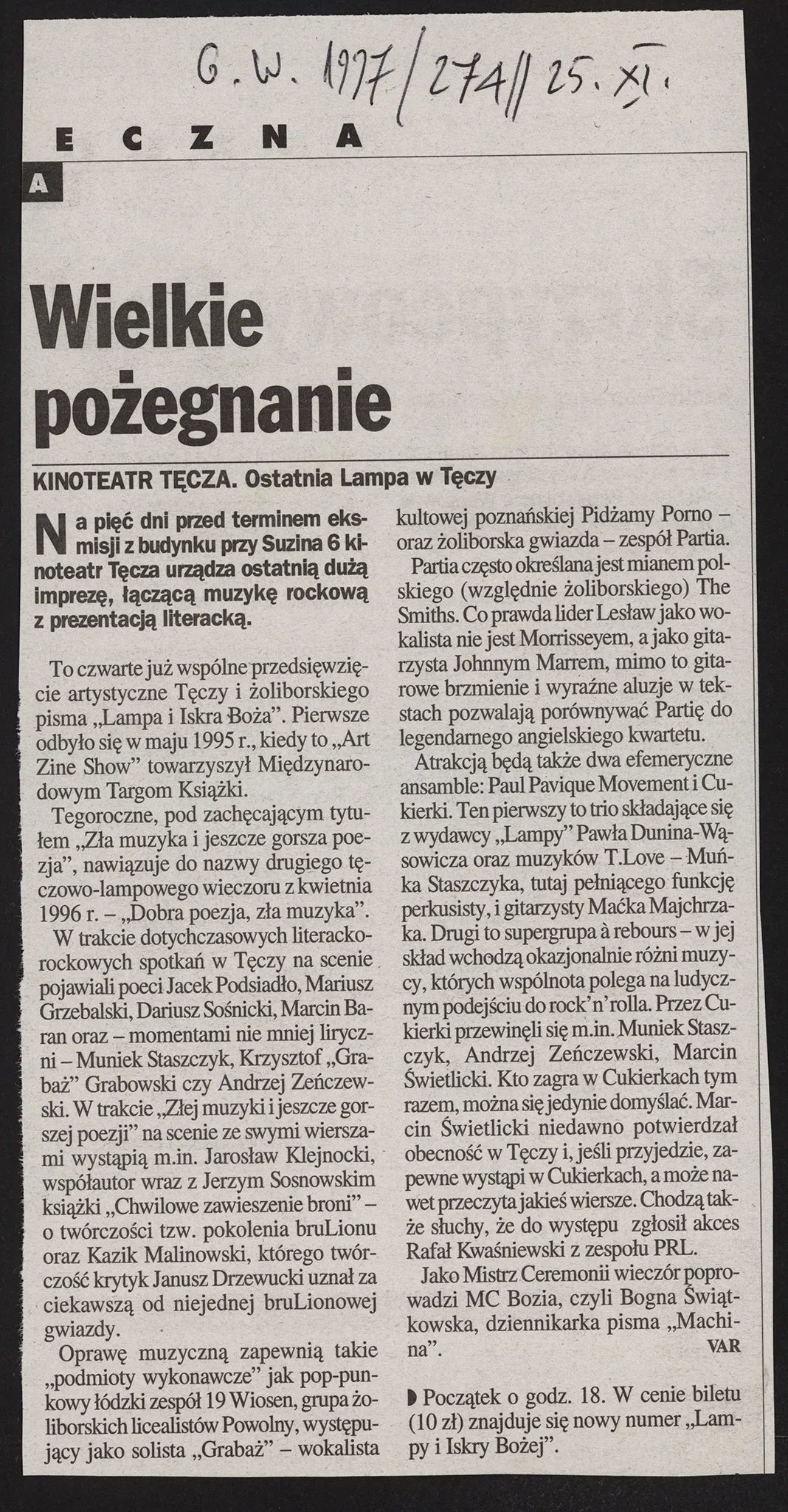 recenzja Artykuł o zamknięciu „Tęczy” – „Gazeta Stołeczna” 25.11.97 data 1997 format kolor cz/b osoby widoczne miejsce copyright czas trwania opis