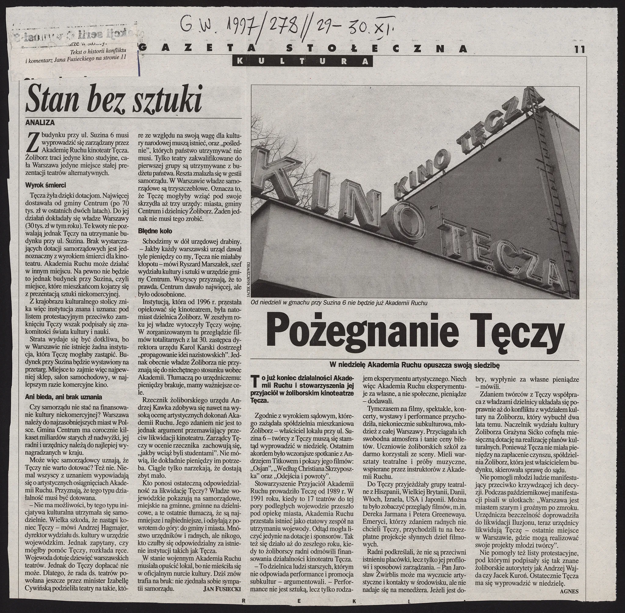 recenzja Artykuł o zamknięciu „Tęczy” – „Gazeta Stołeczna” 29-30.11.97 data 1997 format kolor cz/b osoby widoczne miejsce copyright czas trwania opis