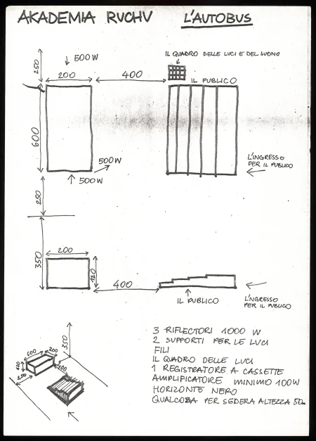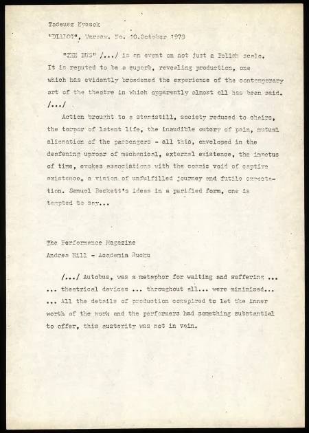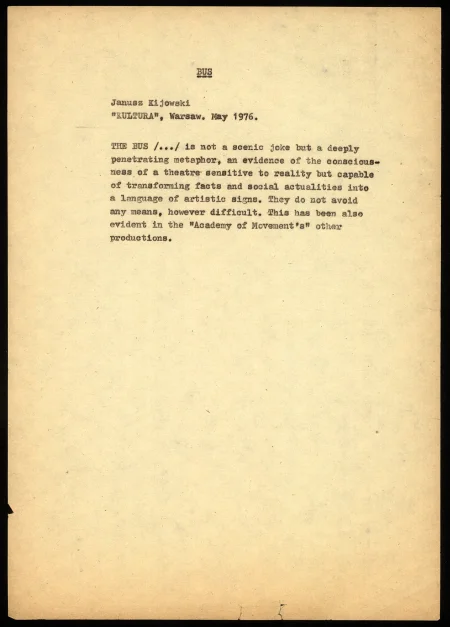 – w ramach „Konwenium” – projektu warsztatowego z udziałem Eugenia Barby i Jerzego Grotowskiego podczas Międzynarodowego Festiwalu Teatralnego BITEF w Belgradzie, Autobus zrealizowano z obsadą międzynarodową, wybraną spośród uczestników.
