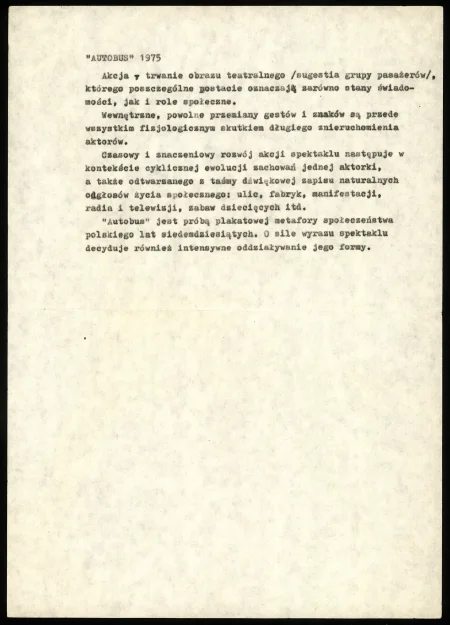 W spektaklu typowy rozwój akcji zastąpiło trwanie nieruchomej grupy ludzi usytuowanych na niewidocznym podeście. Sposób oświetlenia sugerował, że obraz tej grupy wyłania się z ciemnego otoczenia, sprawiając wrażenie zawieszonego w powietrzu. Poszczególne postacie uformowane były w sposób sugerujący role przyjęte przez pasażerów miejskiego autobusu, którego pierwowzorem był motyw stanowiącego metaforę zdehumanizowanego społeczeństwa lat 50. obrazu Bronisława W. Linkego Autobus, a także pochodzącego z tego samego czasu obrazu Andrzeja Wróblewskiego Kolejka trwa. Kierowca, para studentów, robotnik, którego ręce ułożone są w czytelny gest odmowy, matka tuląca do piersi niemowlę, mężczyzna podtrzymywany przez kobietę w pozycji „piety” – to czytelne znaki pierwszego planu tej grupy figuralnej.