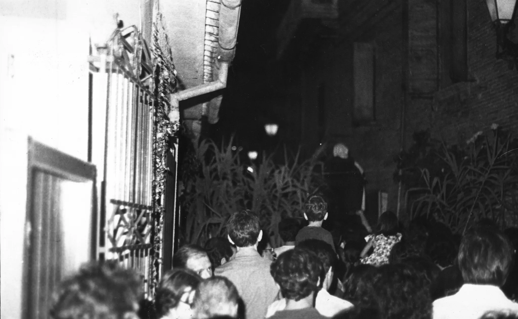 Przestrzeń miejska. Wąską uliczką pomiędzy budynkami przechodzi tłum ludzi. Nad ich głowami zwisają strzępy płachty. Po prawej stronie na ścianie wisi tabliczka z napisem "PIAZETTA GALASSI"
