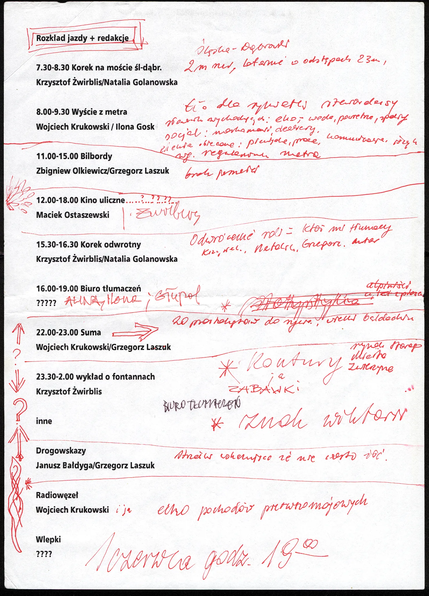 16.00 Biuro tłumaczeń – na Krakowskim Przedmieściu stworzono specjalne stanowiska (w rodzaju rozmównic) z udziałem specjalistów przygotowanych do omawiania najbardziej drażliwych problemów rzeczywistości, odpowiadających na wszystkie pytania zaintrygowanych taką możliwością przechodniów.