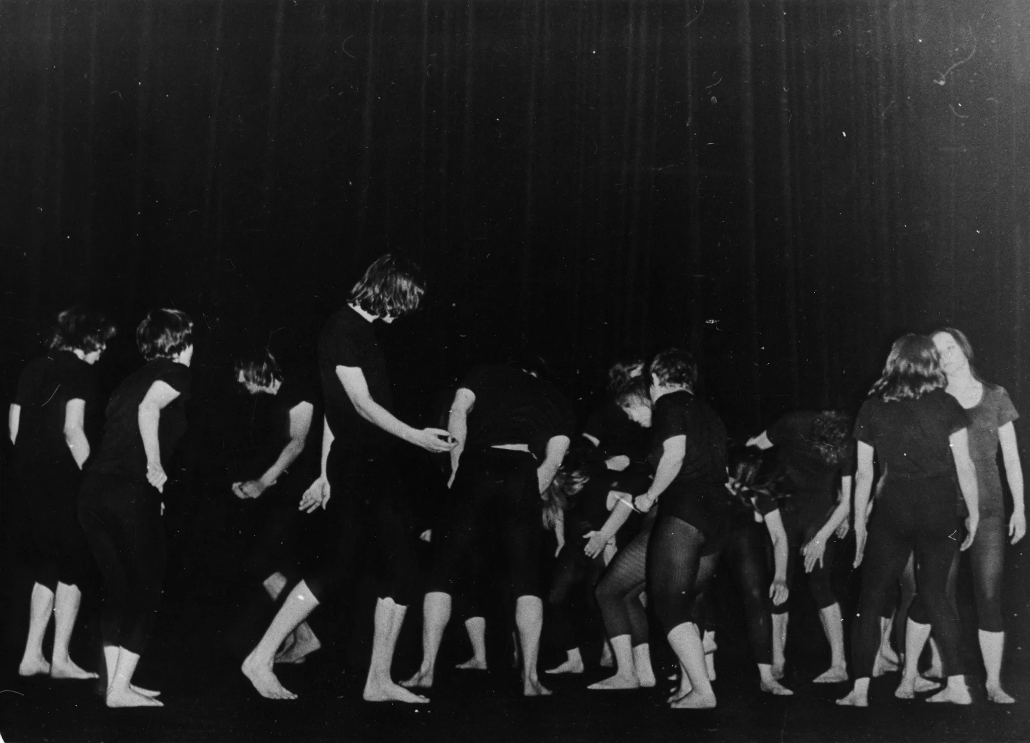 Aktorzy i aktorki siedzą na podłodze z panelu, tworząc duży okrąg. W środku okręgu czterech aktorów. Wyglądają, jakby tańczyli. Reszta aktorów im się przygląda.