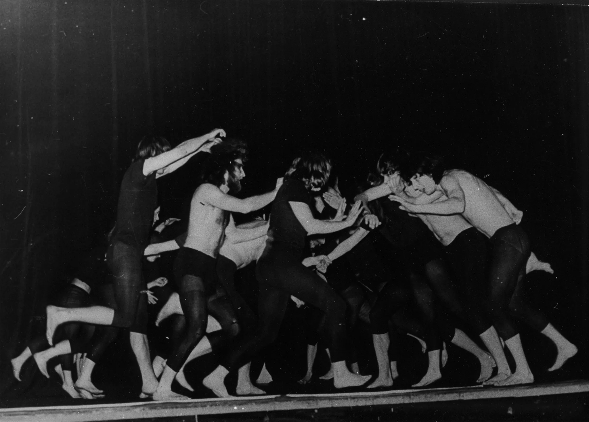 Na pustej scenie kłębi się grupa aktorów. Wszyscy są boso. Niektórzy ubrani są w czarne spodenki i czarne podkoszulki, inni mają nagi tors. Ich zbiorowy ruch sprawia wrażenie chaosu. Z tyłu widać lekko oświetloną opuszczoną kurtynę.