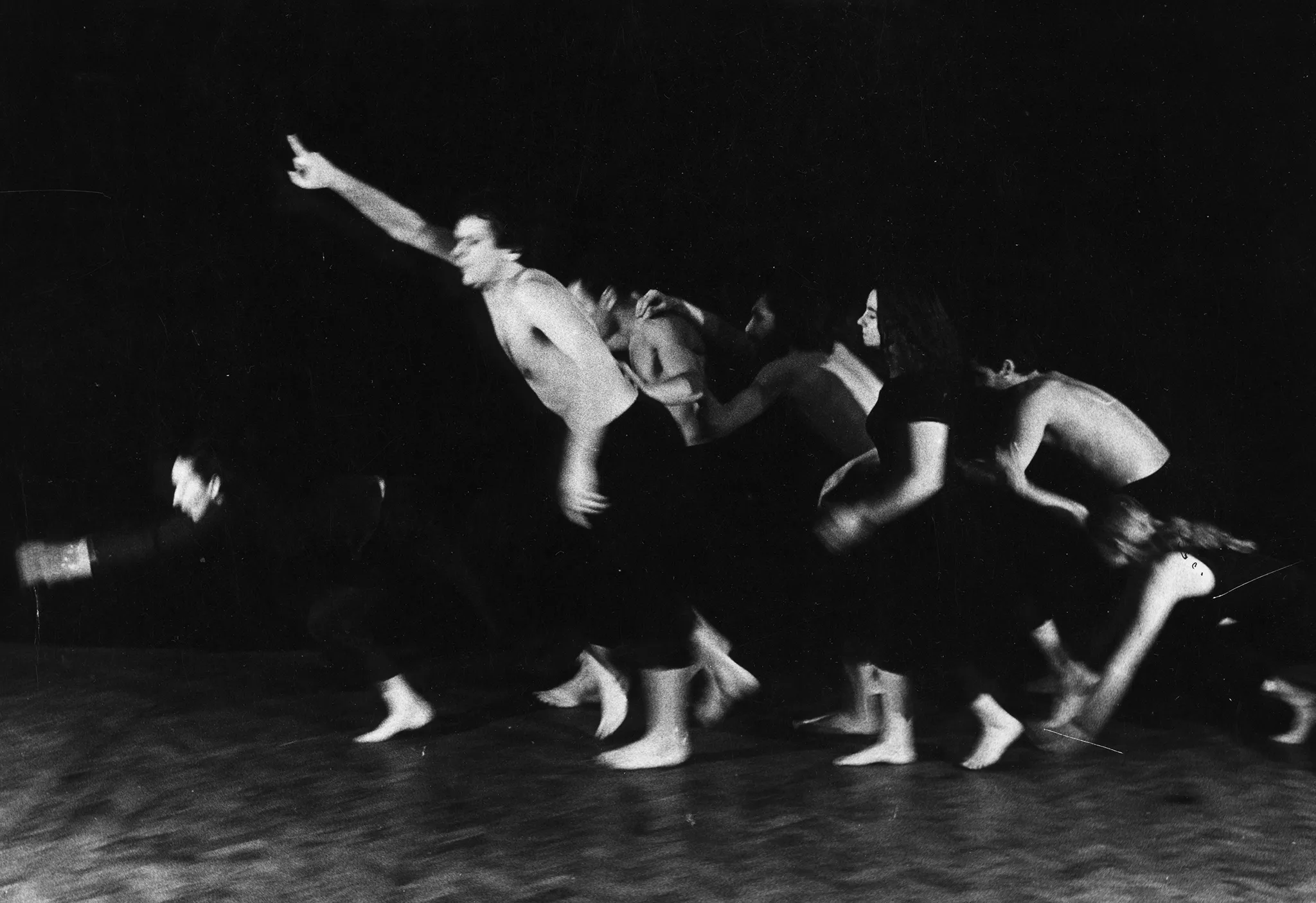 Niewyraźne, rozmazane zdjęcie. Grupa bosych aktorów wygląda, jakby tańczyła.