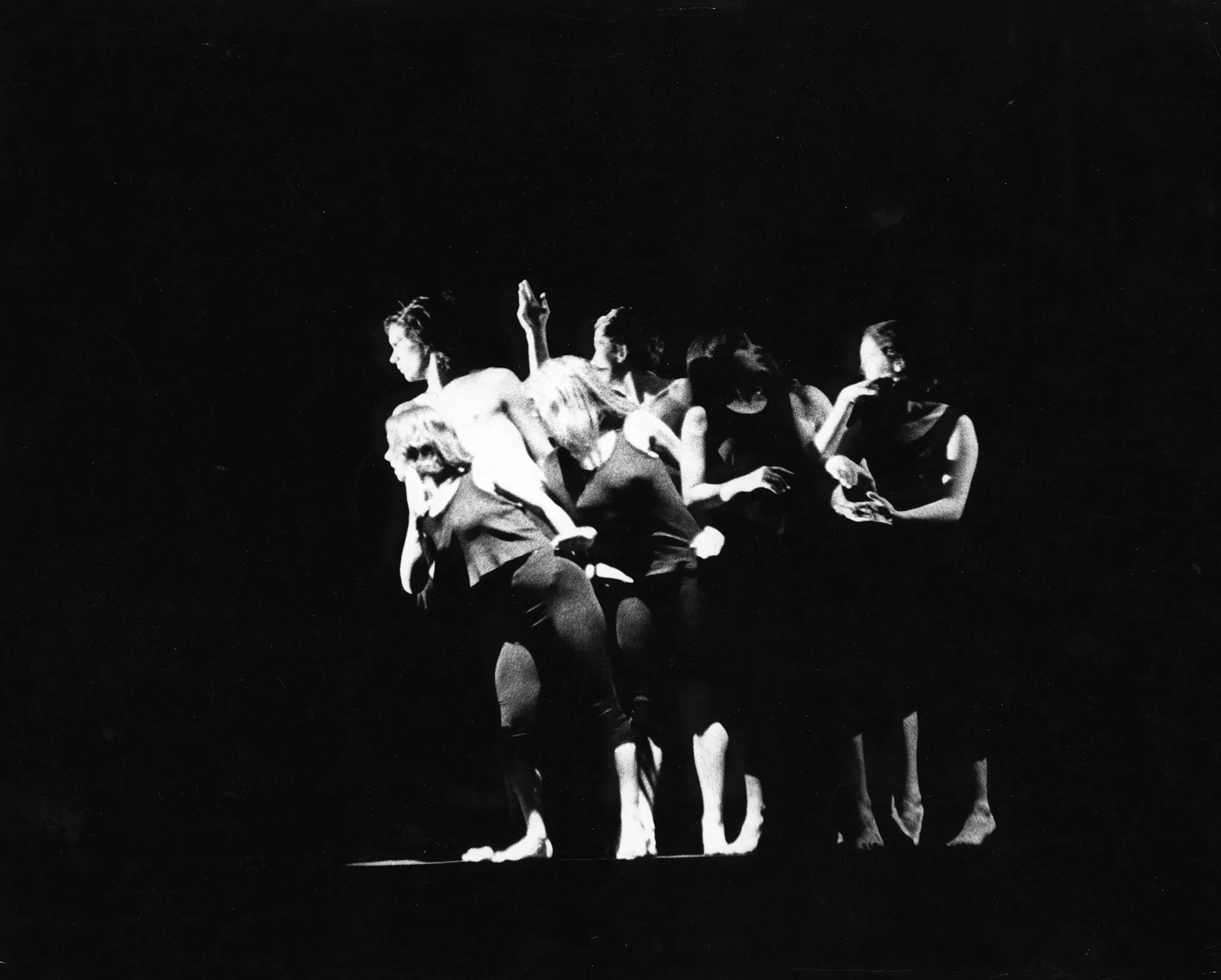 Ściśnięta grupa aktorów i aktorek stoi na pustej scenie. Są boso, ubrani w czarne spodenki i czarne podkoszulki. Niektórzy nie mają podkoszulek. Aktorzy i aktorki po lewej stronie z zaciekawieniem patrzą w lewą stronę. Dwie aktorki po prawej stronie są odrębne od grupy. Są ze sobą w interakcji.