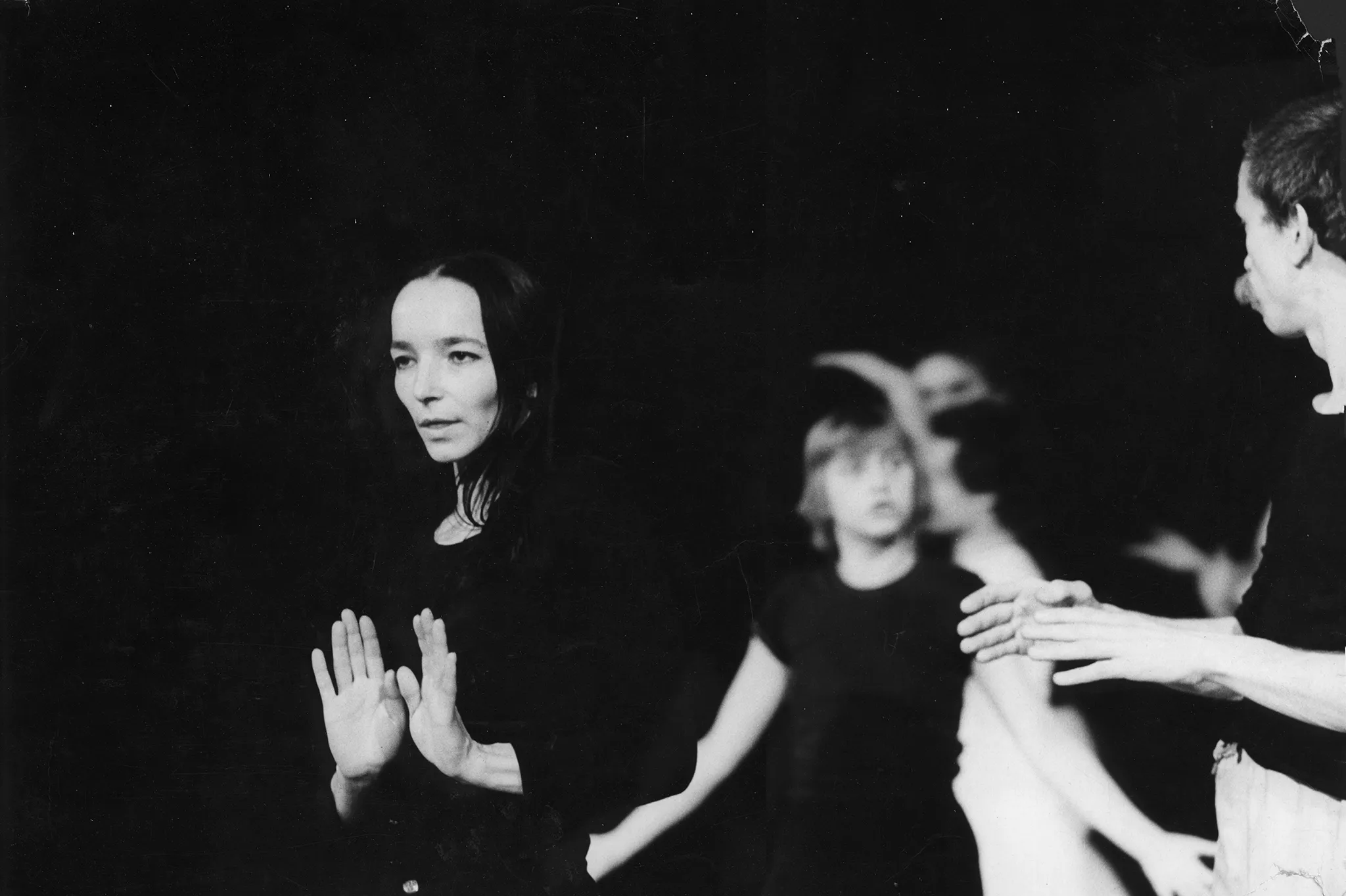 W centrum stoi aktorka widoczna od pas w górę. Stoi zwrócona twarzą w stronę widza. Ma delikatnie uniesione ręce i pokazuje wnętrza dłoni. Ma szczupłą twarz, wysokie czoło i duże oczy. Po prawej stronie stoi aktor. Widać tylko jego fragment. Jest zwrócone w stronę widza profilem. Ma delikatnie uniesione ręce. W tle niewyraźnie widać grupę aktorów i aktorek. Wyglądają, jakby tańczyli.