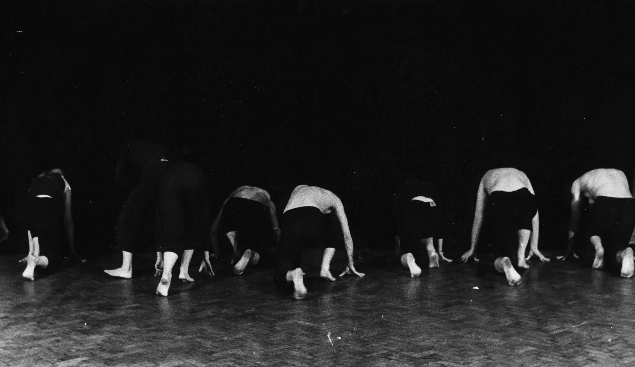 Rozmazane zdjęcie. Tańcząca grupa aktorów i aktorek rozstawionych na sali na tle czarnej płachty. Aktorki ubrane są w czarne spodnie i czarne koszulki. Aktorzy ubrani są w czarne spodenki, mają nagie torsy. Pod czarną płachtą tańczy aktor z nagim torsem ubrany w jasne spodenki. Jest bardzo szczupły.