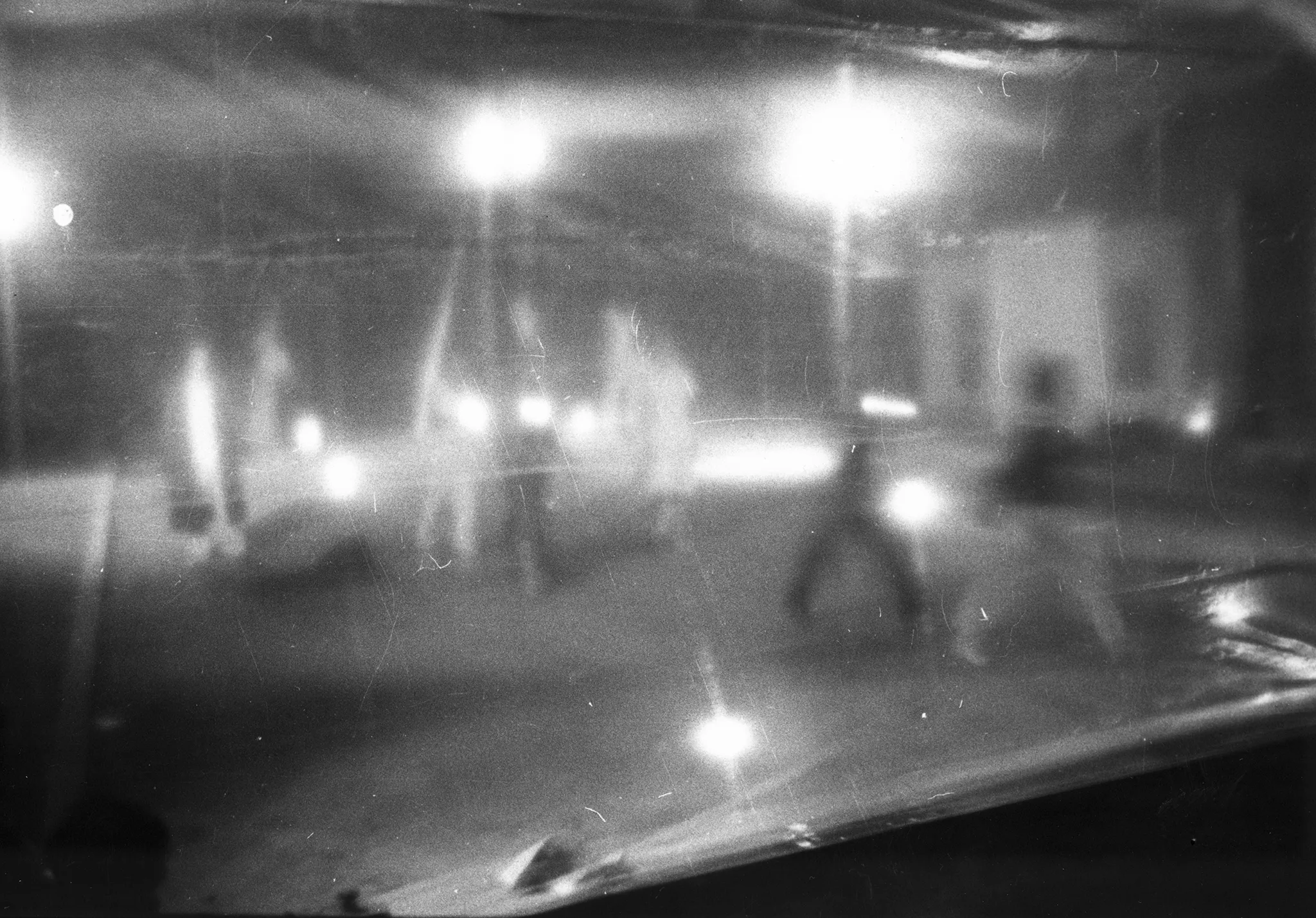 Przestrzeń miejska. Między budynkami wisi duża przeźroczysta płachta. Za płachtą stoi ledwo widoczna grupa aktorów i aktorek.