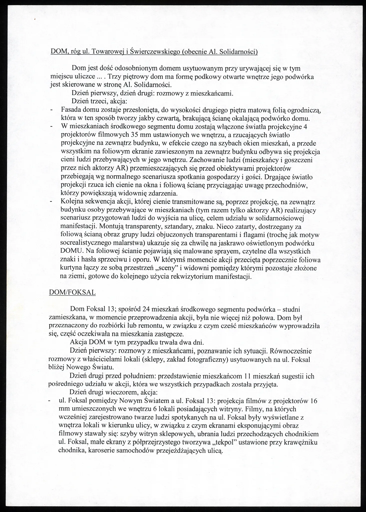 Projekt z serii Dom, zapoczątkowanej w 1978 roku. Forma i przebieg kolejnych akcji wynikały ściśle z ich usytuowania i kontekstu budynku, w którym były realizowane. Dom VI został zrealizowany w obrębie i w pobliżu kamienicy przy ul. Foksal 13 w Warszawie w maju 1986 roku, na zaproszenie Przeglądu Architektury Warszawskiej. Dom przeznaczony był do remontu, część mieszkańców już się z niego wyprowadziła, część oczekiwała na mieszkania zastępcze. Pierwszego dnia zespół AR prowadził rozmowy z mieszkańcami oraz właścicielami położonych w okolicy sklepów i zakładów (np. zakładu fotograficznego). Drugiego dnia przed południem członkowie grupy przedstawili lokatorom jedenastu mieszkań sugestie dotyczące ich pośredniego udziału w akcji. Wszystkie sugestie zostały przyjęte. Wieczorem odbyła się właściwa akcja. We wnętrzach sześciu sklepów i zakładów znajdujących się między kamienicą a Nowym Światem umieszczono projektory filmowe 16 mm. Filmy, na których zarejestrowano twarze ludzi spotykanych na ul. Foksal, wyświetlono tak, że ekranami stawały się szyby witryn sklepowych, ubrania ludzi przechodzących chodnikiem, małe ekrany z półprzejrzystego tworzywa ustawione przy krawężniku, karoserie przejeżdżających samochodów. Równocześnie w kamienicy zapalono światła wszystkich mieszkań, iluminowano oszkloną klatkę schodową, tworząc efekt lirycznej afirmacji domu. Aktorzy AR wynosili kolejno z zamieszkałych jeszcze lokali krzesła oraz fotele, z którymi mieszkańcy byli jeszcze związani. Ustawili je na podwórku, zasiedli na nich, przez wielokrotne powtórzenie tej czynności demonstrowali potencjał relacji zachodzących między człowiekiem a wybranym przez niego miejscem. W kolejnym fragmencie towarzysząca akcji muzyka nagle się urywała, kolorowe iluminacje gasły. Włączano zimne, białe światło, które ukazywało brud podwórka, zużycie foteli i krzeseł.