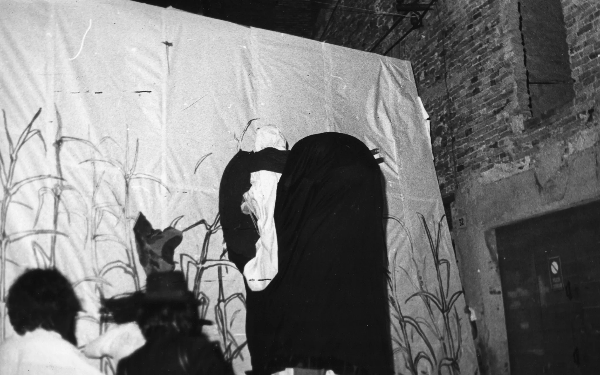 Obok ceglanego budynku stoi wielka biała płachta. Na płachcie namalowane są rośliny przypominające trzciny. Płachta w centrum przysłonięta jest czarnym obłym materiałem. Po lewej stronie stoją dwie osoby zwrócone plecami do widza. Widać tylko ich głowy.