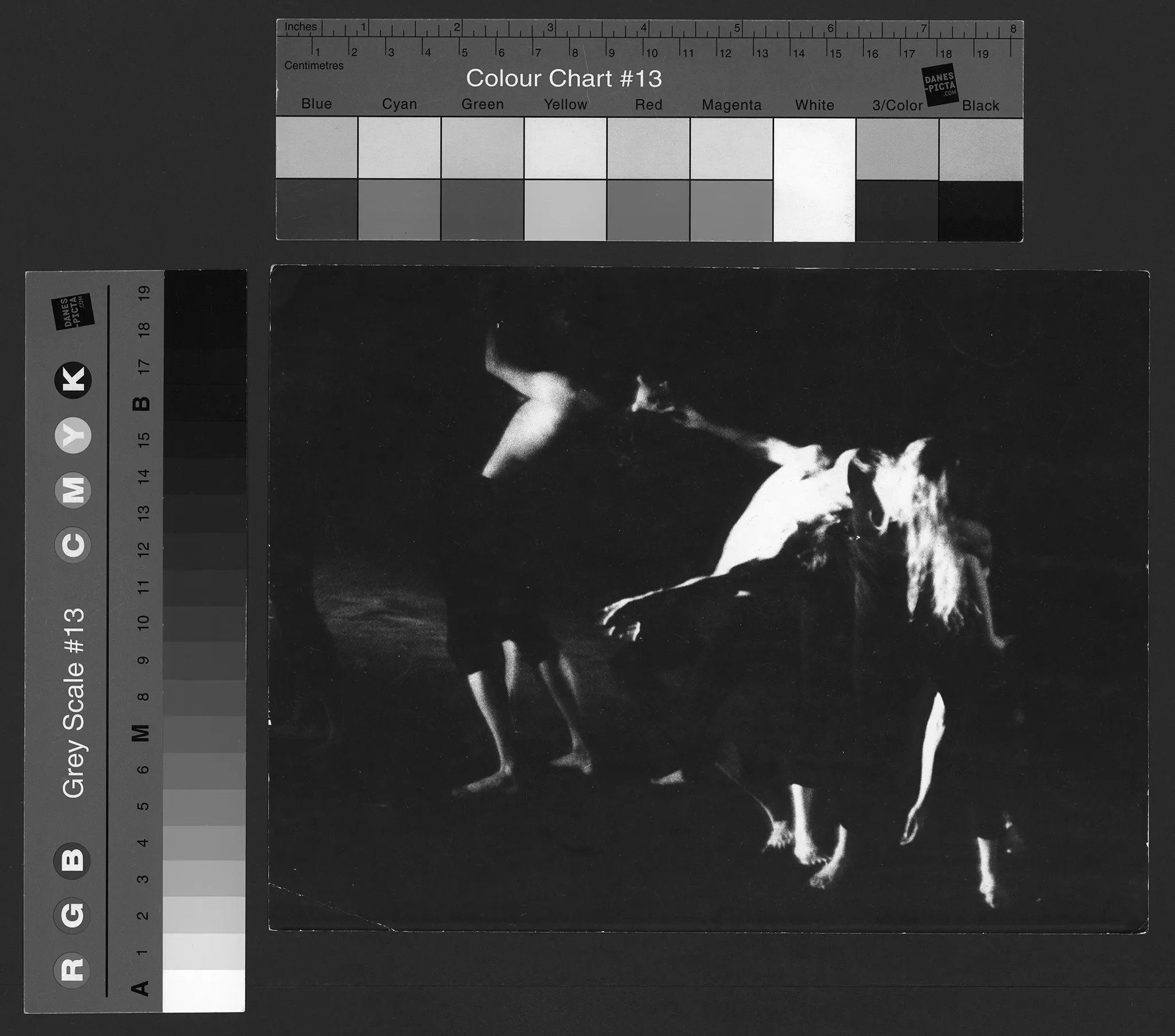 Niewyraźne, prześwietlone zdjęcie. Z przodu sceny troje aktorów siedzi lub klęczy na podłodze. W głębi sceny grupa aktorów stoi w ekspresyjnych pozach. Po lewej stronie z cienia wyłania się ledwo widoczna psotać.