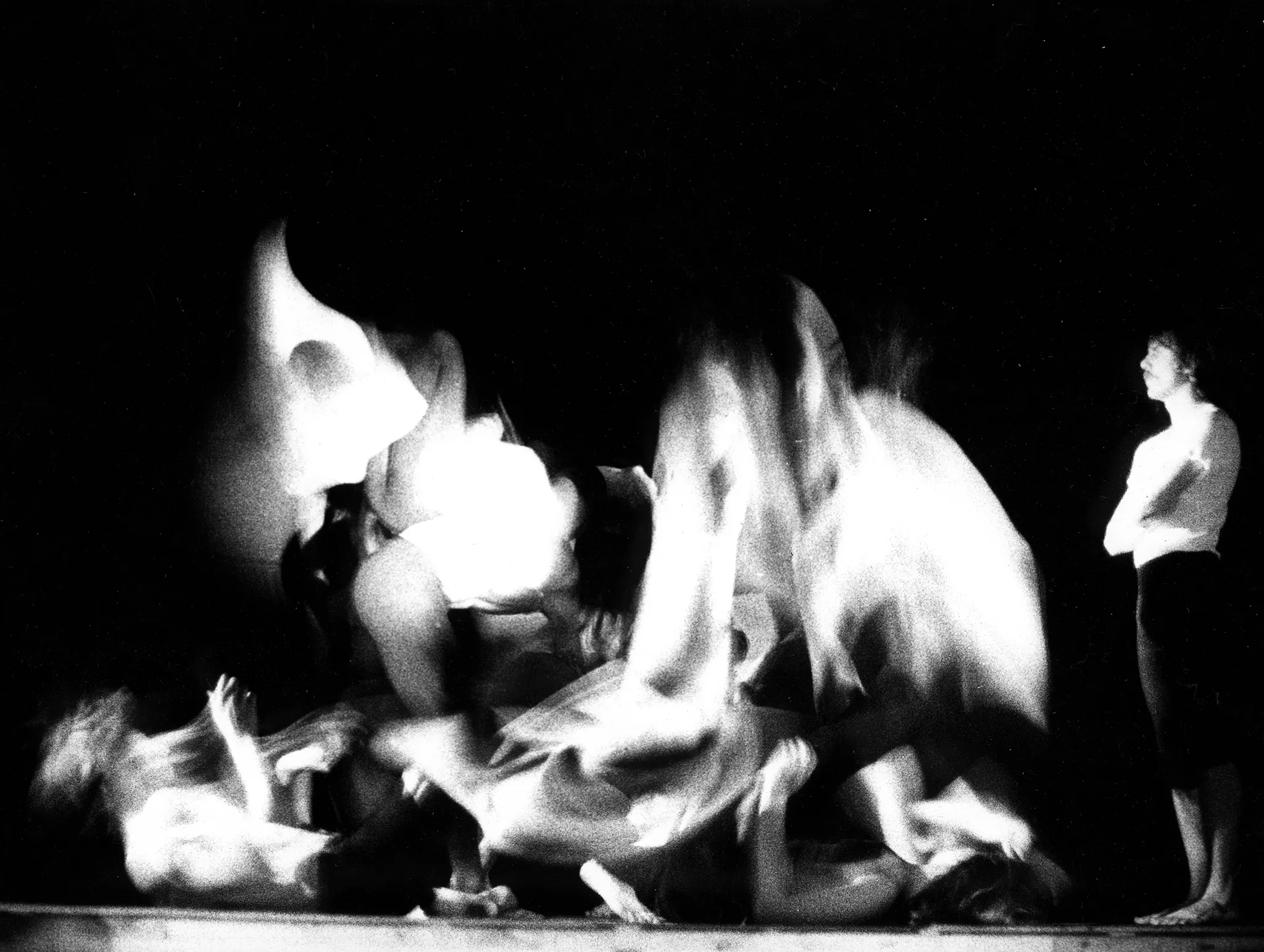 Niewyraźne, rozmazane zdjęcie. Grupa bosych aktorów wygląda, jakby tańczyła.