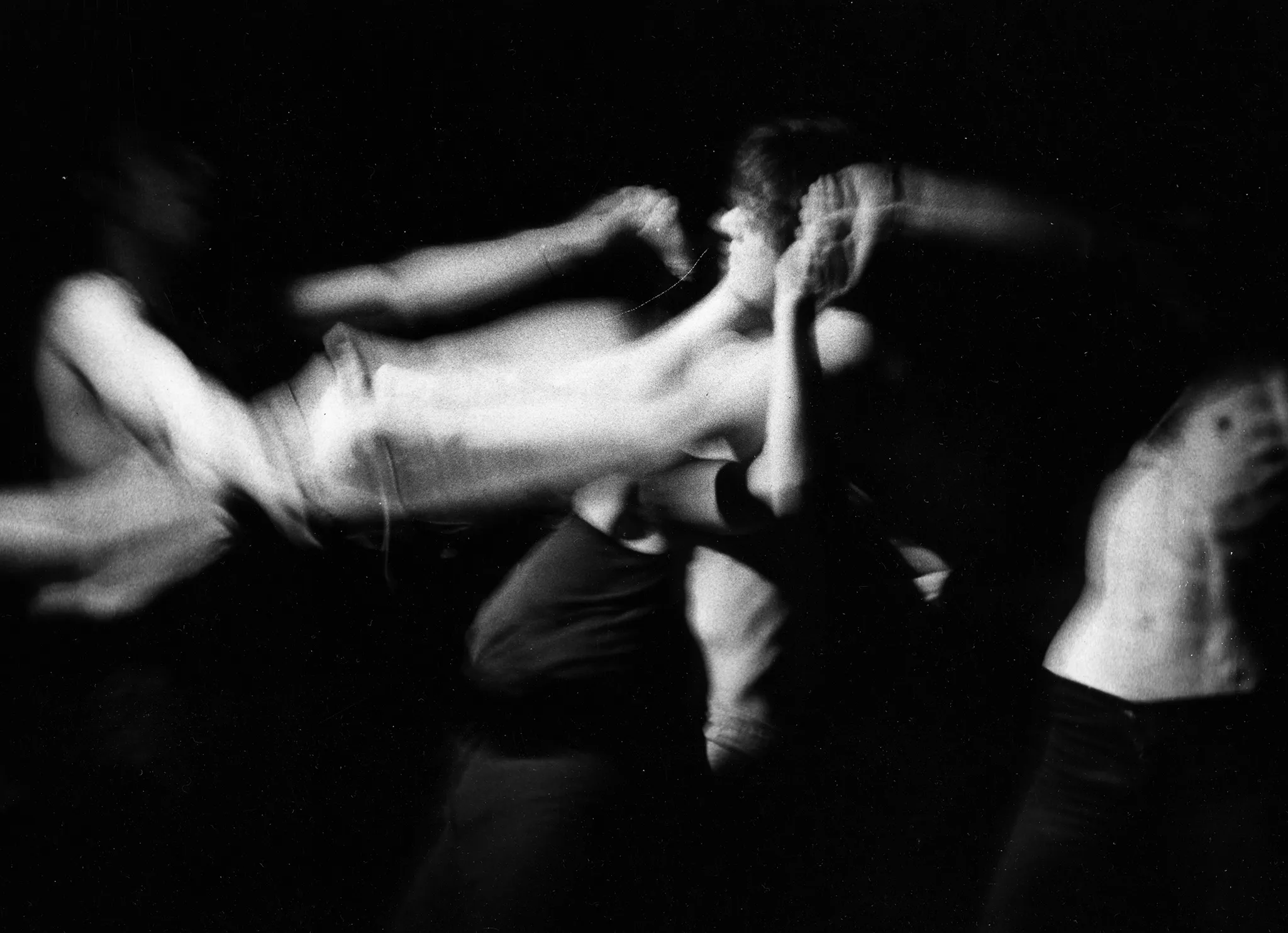 Niewyraźne, rozmazane zdjęcie. Po lewej stronie bosa grupa aktorów ubranych w czarne spodenki i czarne podkoszulki wygląda jakby tańczyła. Po prawej stronie dwie osoby odłączone od grupy stoją w ekspresyjnych pozach.