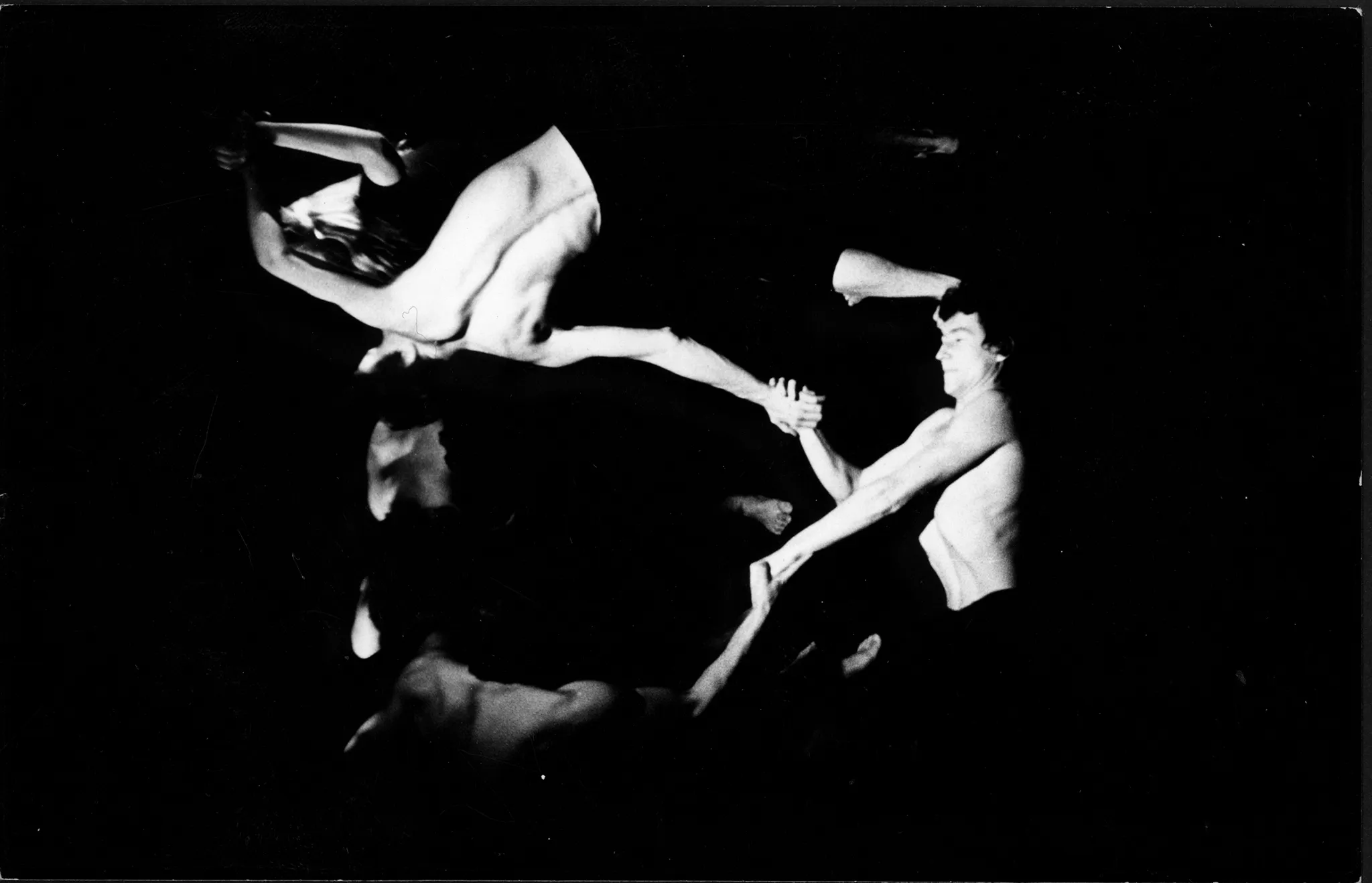 Na środku pustej sceny grupa aktorów wykonuje akrobacje. Są w bliskim kontakcie cielesnym. Po lewej i prawej stronie stoją zwróceni do nas profilem bardzo podobni do siebie aktorzy ubrani w czarne podkoszulki i czarne spodenki. Są boso. Patrzą na siebie. Grupa jest ustawiona bliżej aktora z prawej strony.