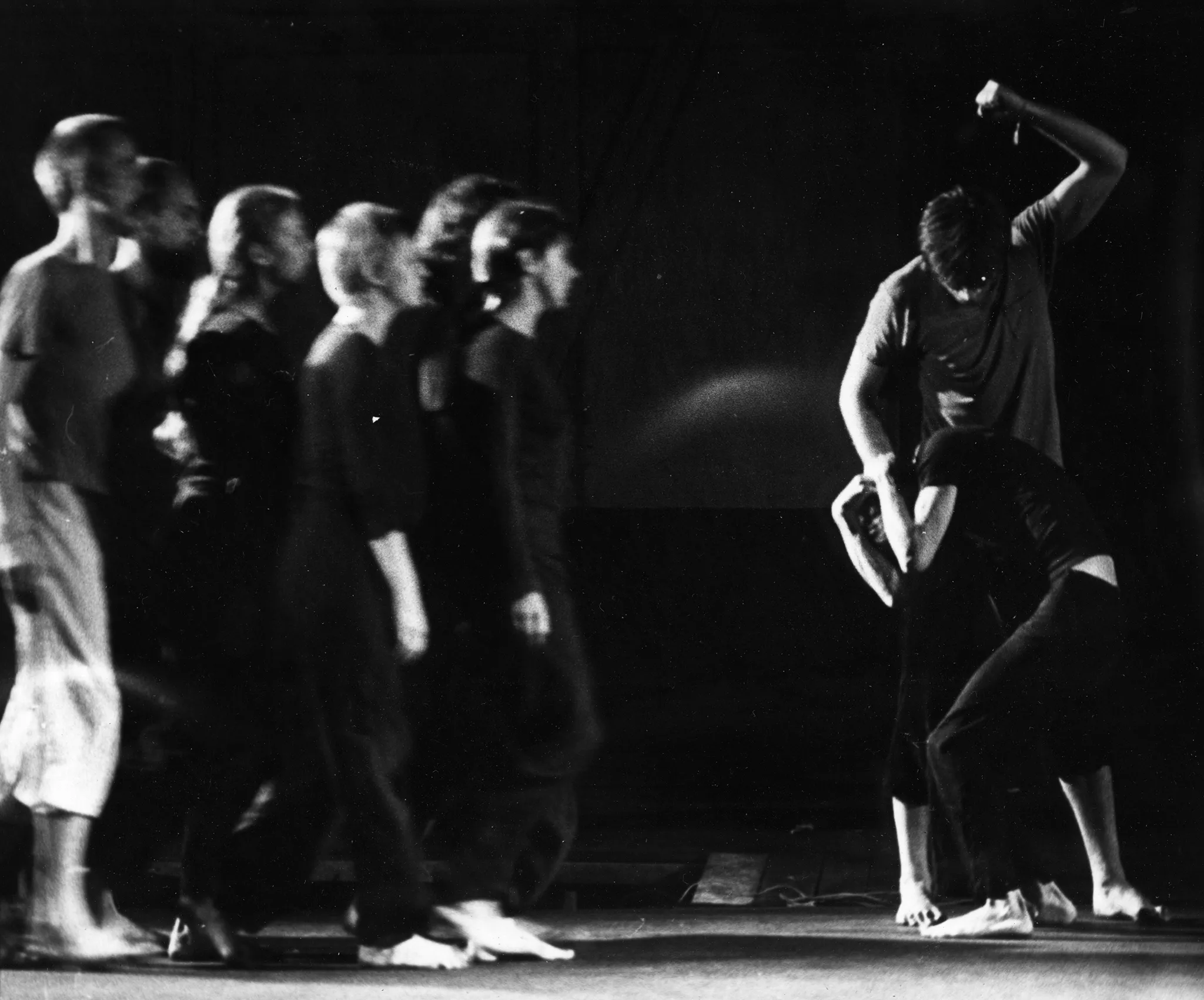 Niewyraźne, rozmazane zdjęcie. Po lewej stronie bosa grupa aktorów ubranych w czarne spodenki i czarne podkoszulki wygląda jakby tańczyła. Po prawej stronie dwie osoby odłączone od grupy stoją w ekspresyjnych pozach.