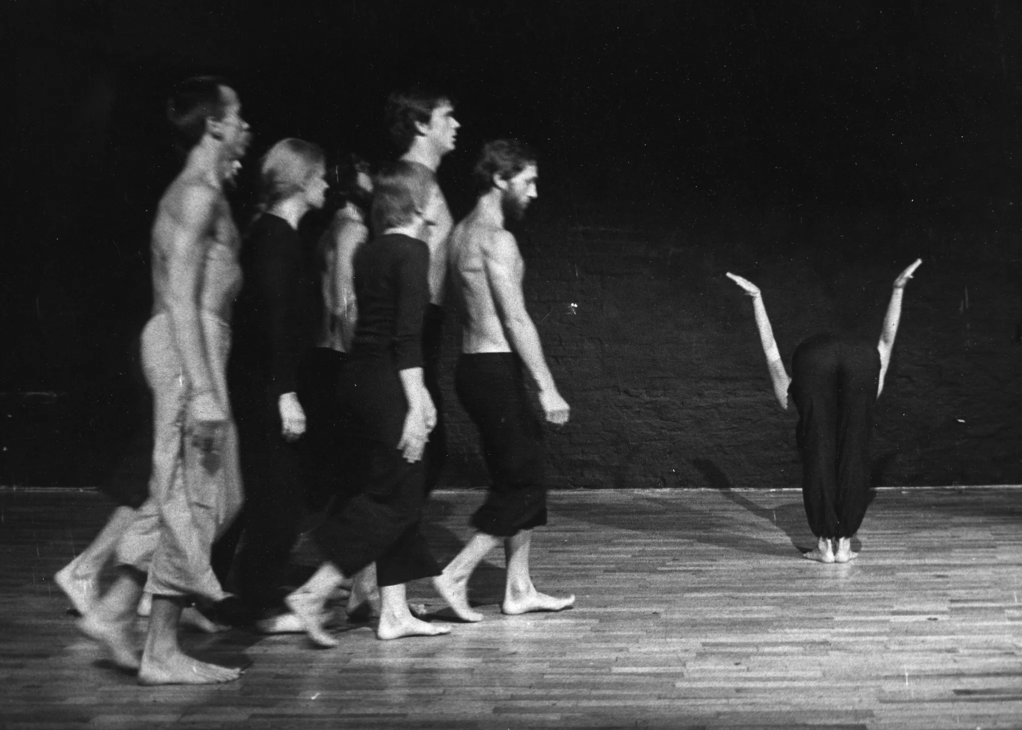 Od lewej strony idzie zwrócona profilem do widza grupa aktorów i aktorek. Aktorzy mają nagie torsy i czarne spodnie poza jednym aktorem, którego spodnie są jasne. Aktorki ubrane są w czarne spodnie i czarne koszulki. Wszyscy są boso. Po prawej stronie stoi odwrócona plecami w stronę widza aktorka. Jest pochylona do przodu i trzyma ręcę uniesione po bokach. Jest boso. Podłoga, na której stoją aktorzy, wygląda na drewnianą.