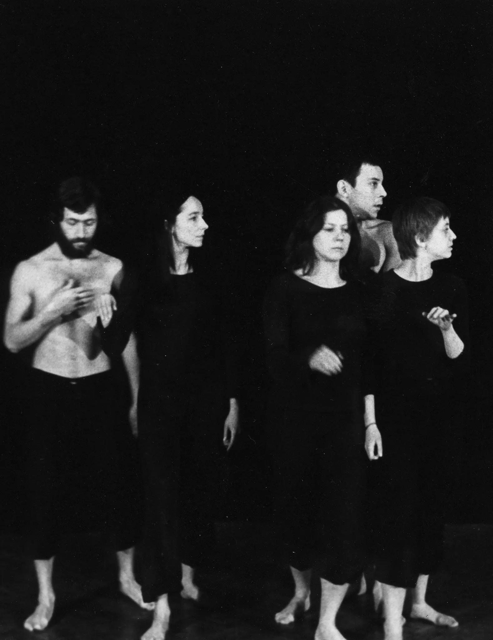 Trzy aktorki i dwóch aktorów. Stoją zwróceni profilem w stronę widza. Aktorzy ubrani są w czarne spodenki i mają nagie torsy. Aktorki ubrane są w czarne spodnie i czarne koszulki. Wszyscy są boso.