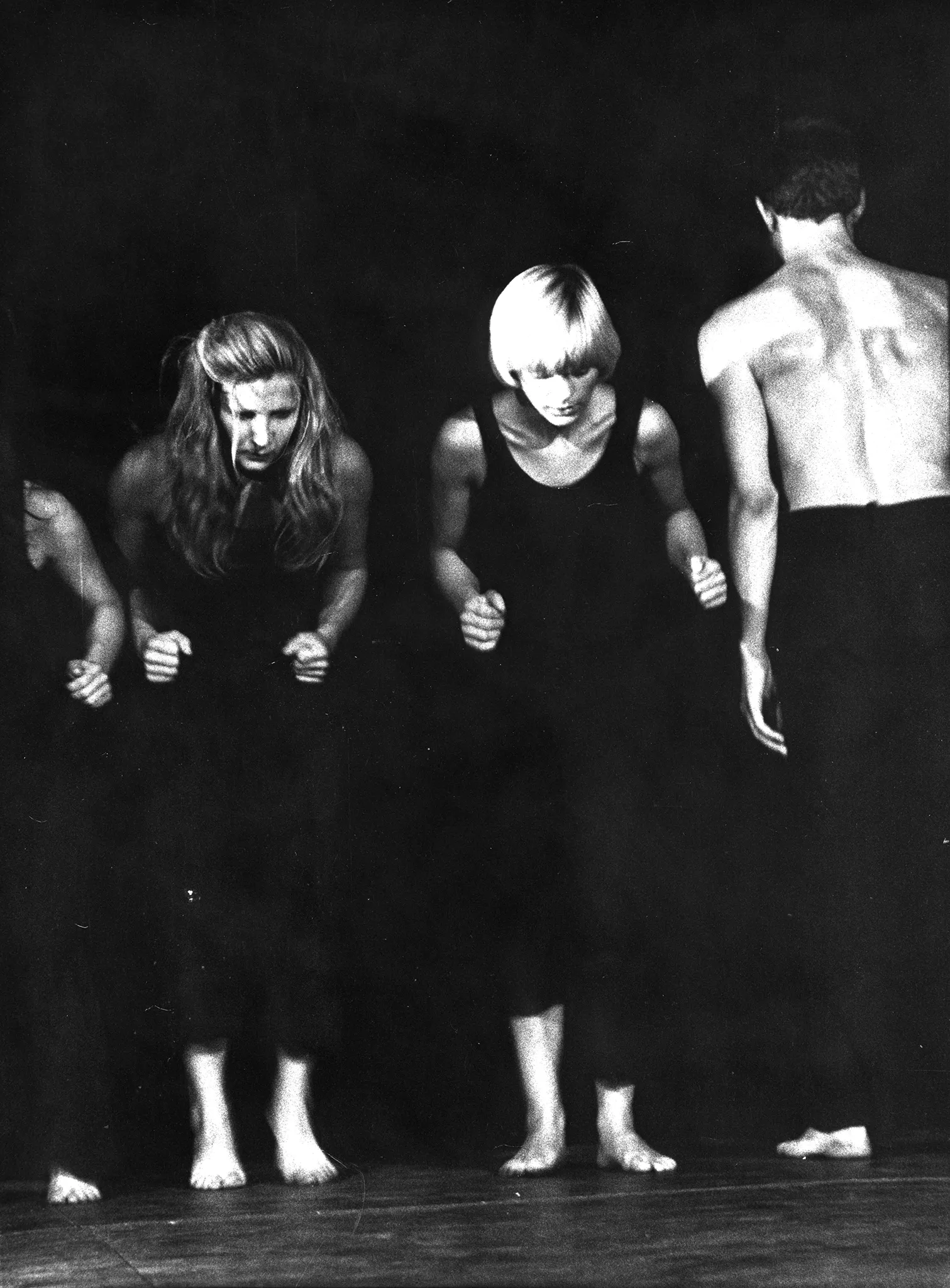 Po lewej stronie, zwrócona twarzą do widza, idzie grupa aktorów i aktorek. Aktorzy są ubrani w czarne spodnie i mają nagie torsy. Aktorki ubrane są w czarne spodnie i czarne koszulki. Po prawej stronie samotnie stoi aktorka. Jest ubrana na czarno, ma krótkie włosy. Wygląda, jakby tanczyła.