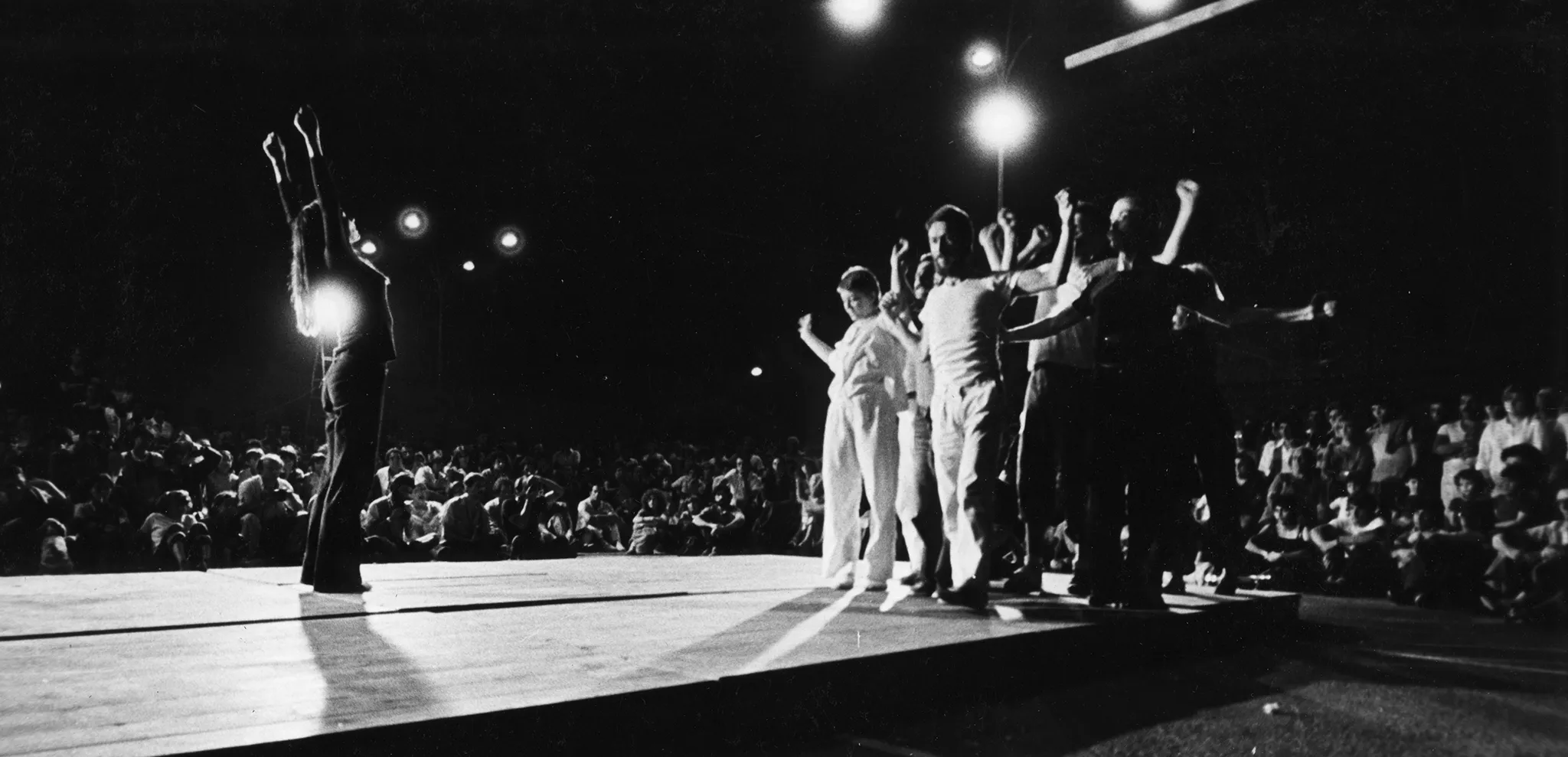 Scena plenerowa. Na krańcu sceny stoi grupa aktorów i aktorek. Uginają ręce, jakby napinali mięśnie. Naprzeciwko grupe stoi aktorka z wysoko wyciągniętymi rękami. Grupie aktorów przygląda się duża grupa widzów. Działania aktorów oświetalają latarnie.