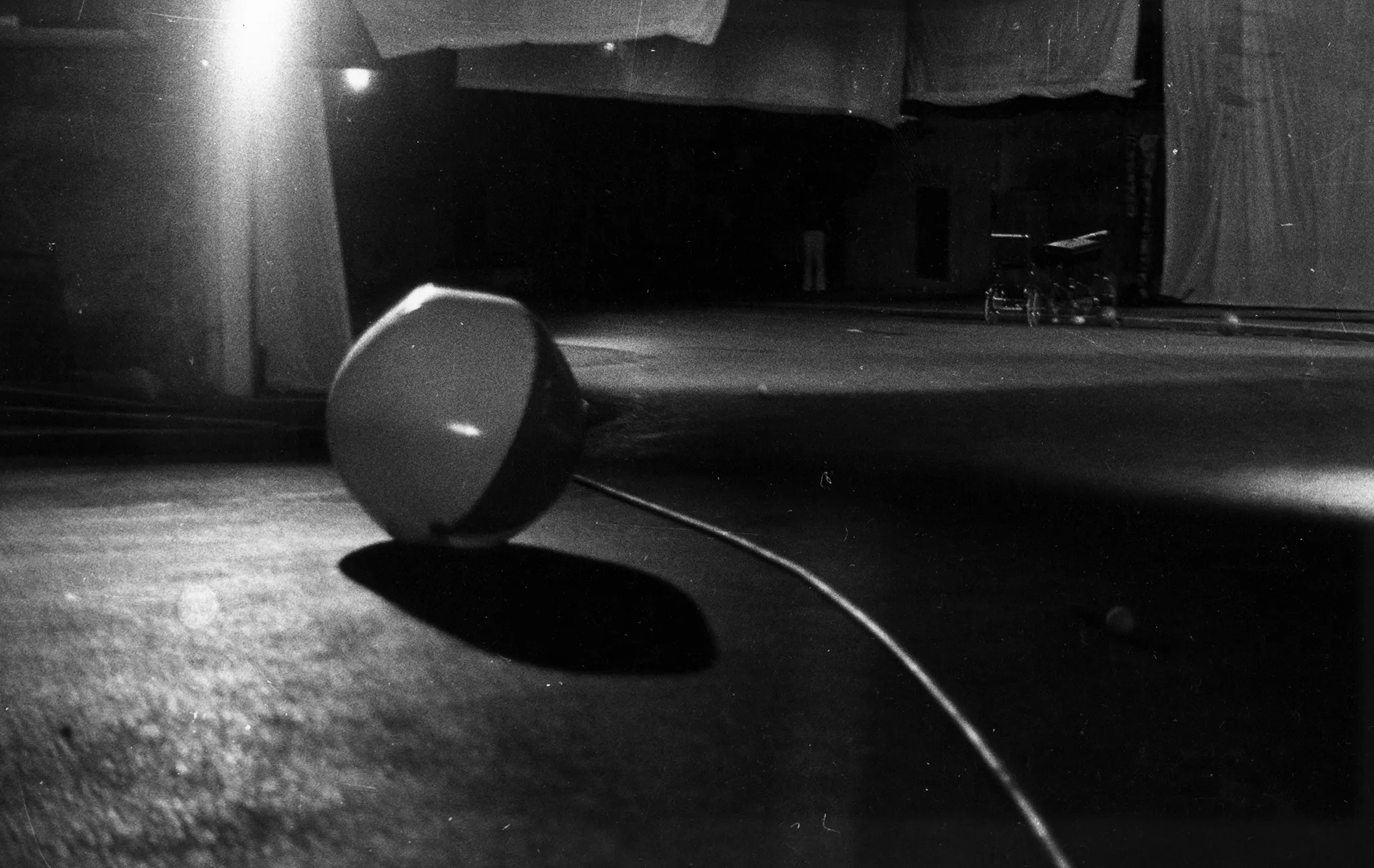Czarno-biała piłka rzuca cień na podłogę. W oddali stoją dwa dziecięce wózki i ledwo widoczna osoba zwrócona do widza plecami.