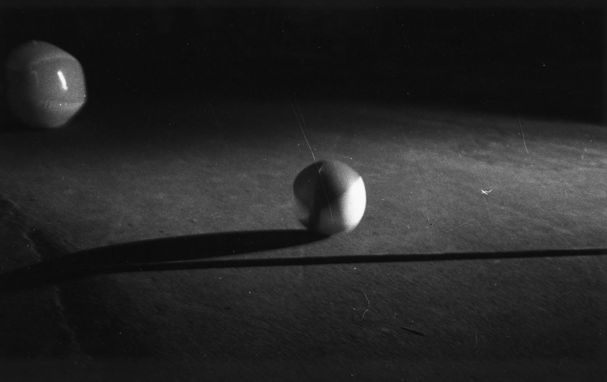 W centrum leży różnokolorowa mała piłka rzucająca cień na podłogę. Za nią, po lewej stronie leży podobna piłka większych rozmiarów.