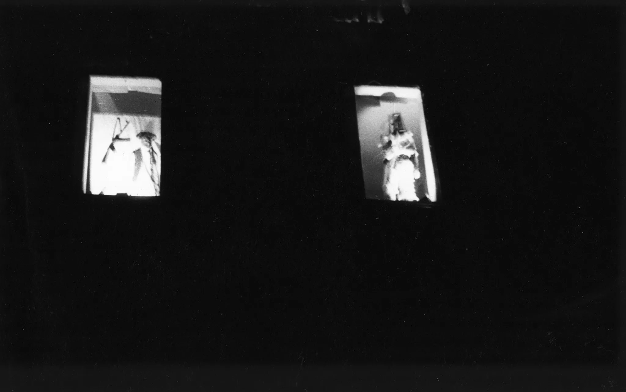 Niewyraźne zdjęcie. Dwa okna zaciemnionego budynku. W każdym oknie stoi jeden aktor zwrócony twarzą w stronę widza.