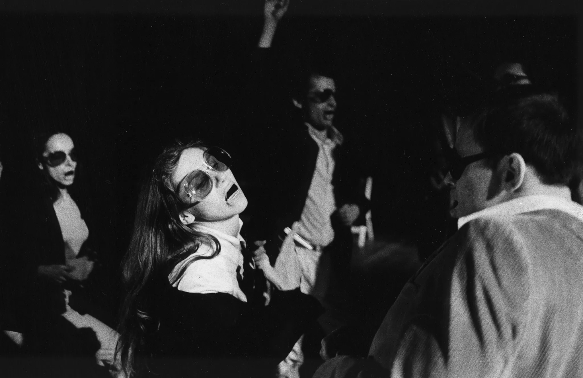 Niewyraźne zdjęcie. Przestrzeń miejska. Między budynkami stoi tłum ludzi. Niektórzy trzymają w rękach białe flagi. W stronę tłumu podchodzi ekipa filmowa.