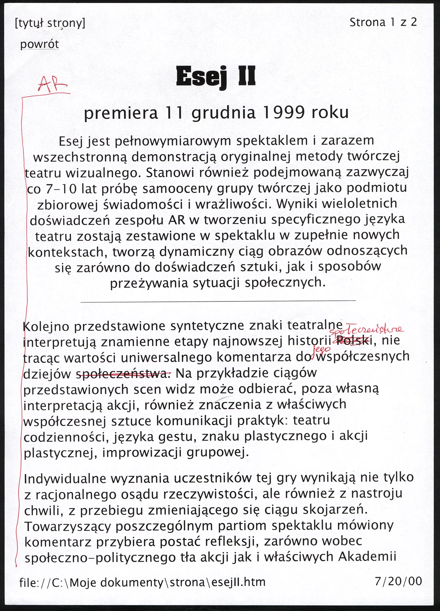 spektakl Esej II (1999) Esej II → Esej II – opis opis, kolor 1999 Esej II → Esej II – ulotka ulotka, cz/b 1999 opis Esej II – opis date 1999 format color kolor visible persons location copyright running time description
