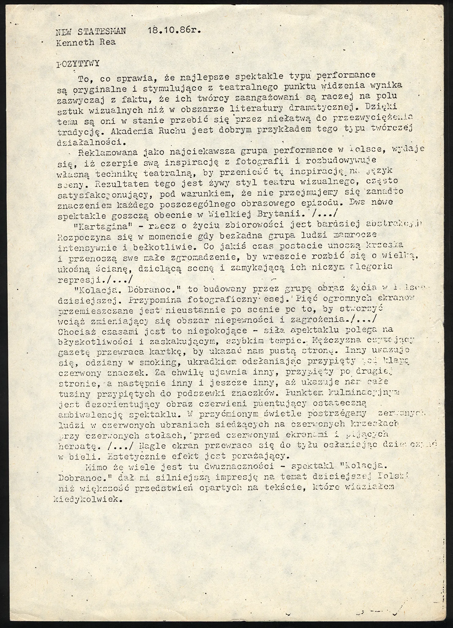 Kolacja. Dobranoc i Kartagina – recenzja w “The Performance Magazine”