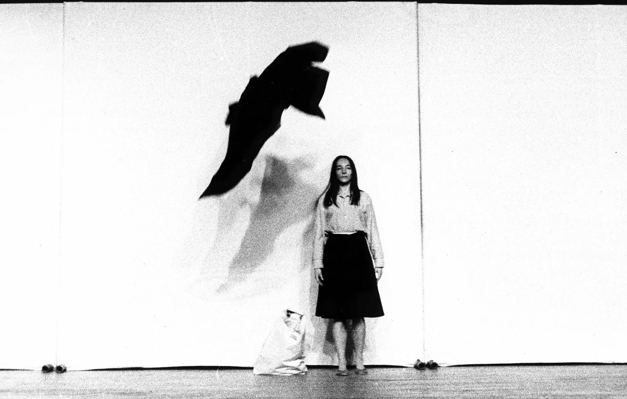 Pod białą ścianą stoi zwrócona twarzą w stronę widza aktorka. Ubrana jest w jasną koszulę i czarną spódnicę. Nad jej głową wisi czarny materiał przypominający dużego ptaka. Obok niej na podłodze stoi biały worek.