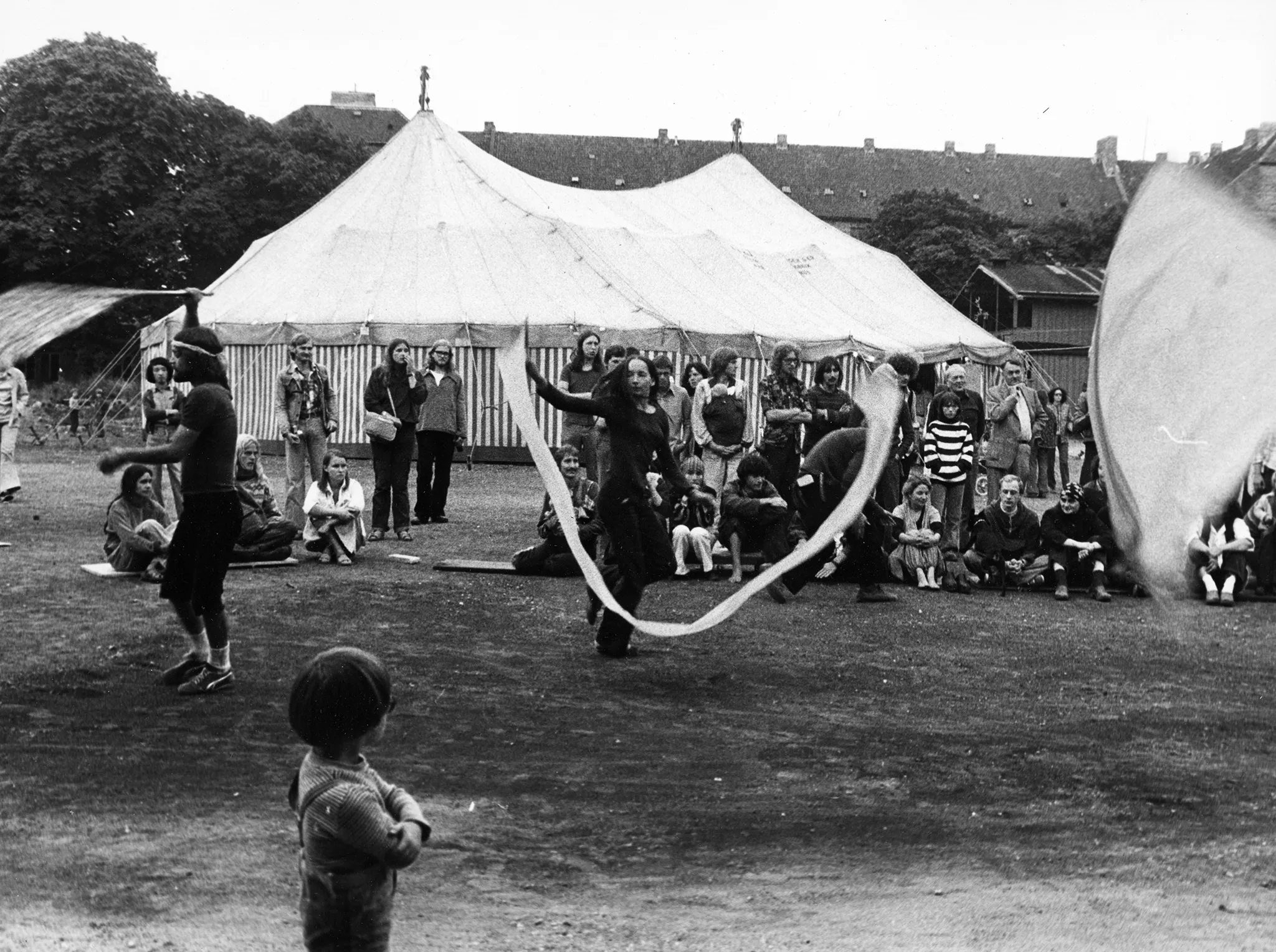 Plener, ruiny jakiegoś budynku. W centrum na czarno ubrana aktorka macha białą wstęgą. W tle siedzą i stoją widzowie, którzy oglądają aktorów. Na pierwszym planie widać dziecko odwrócone plecami do widza. Dziecko ogląda działania aktorskie. Na dalszym planie stoi namiot cyrkowy.