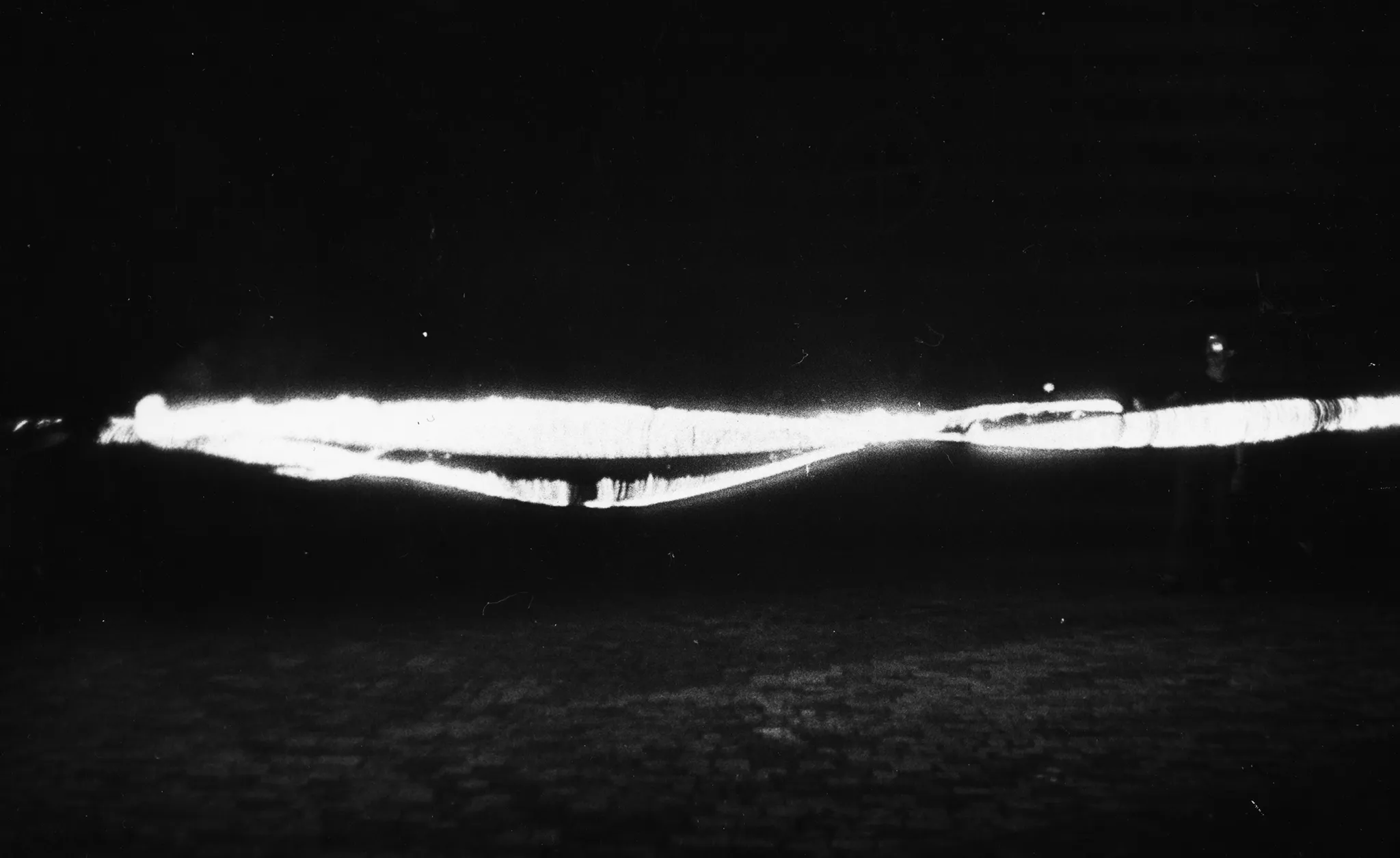 Niewyraźne zdjęcie. Przestrzeń miejska. Na brukowanej ulicy stoi dwóch aktorów. Trzymają w rękach przedmiot emitujący silne światło.