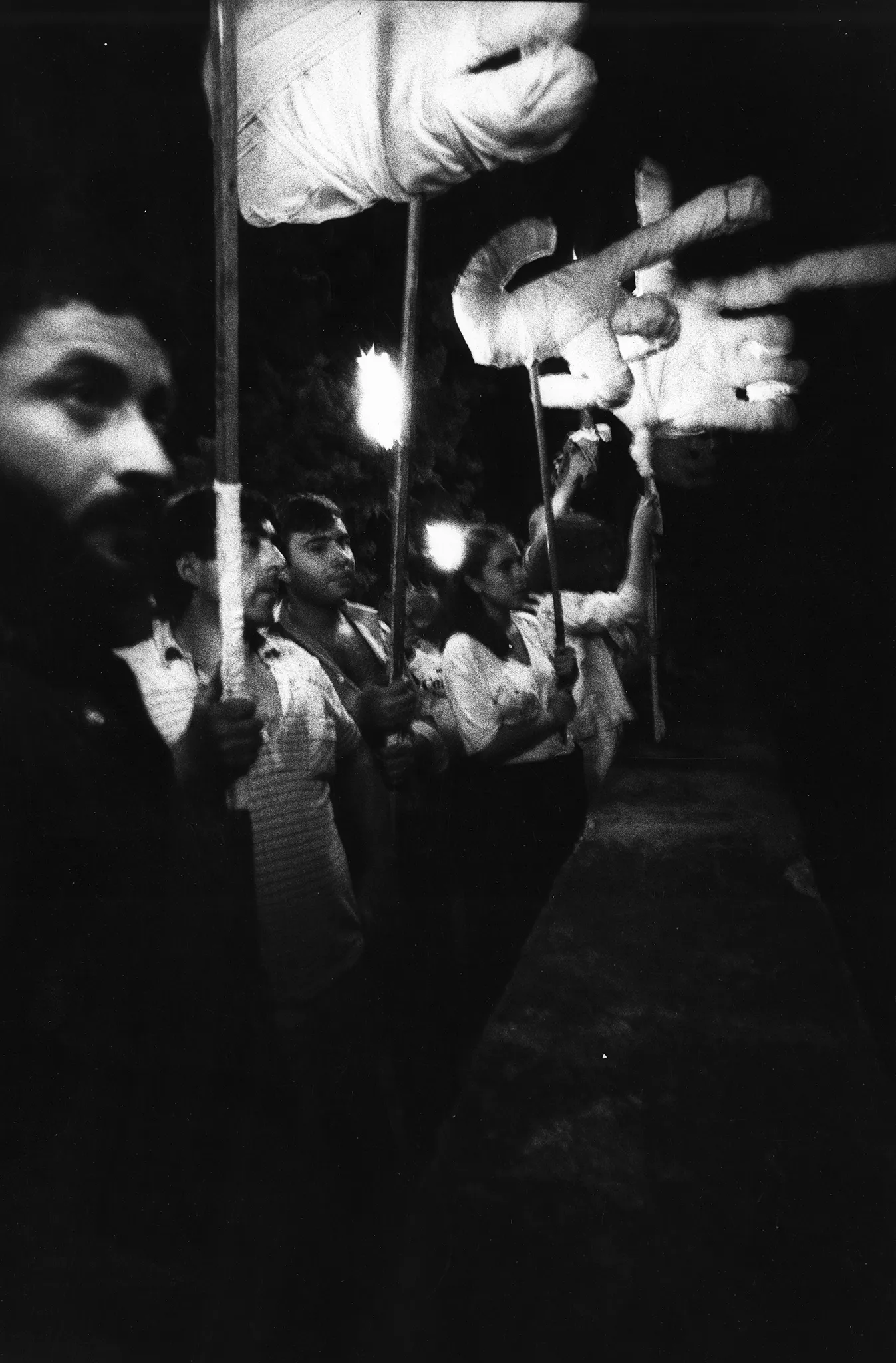 Przestrzeń miejska. Na schodach stoi grupa aktorów. Ubrani są na czarno, na twarzach mają białe maski teatralne. Niektórzy trzymają w rękach wielkie dłonie na kijach. Jeden z aktorów gra na skrzypcach.