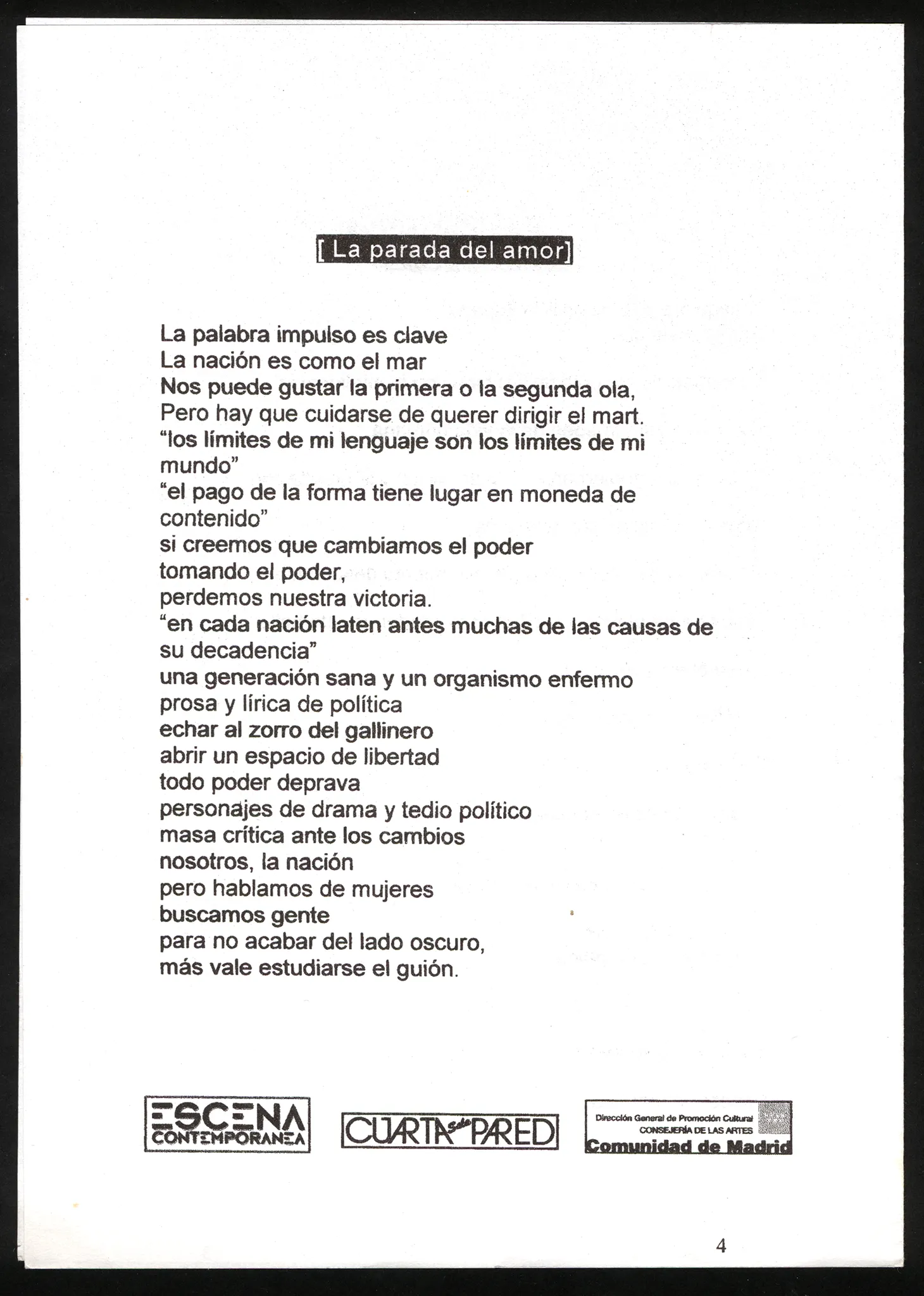 Na małej scenie tańczą trzy osoby aktorskie. Trudno określich ich płeć. Ubrane są białe krótkie sukienki. Na głowach mają blond peruki. Pod sceną siedzi publiczność zwrócona plecami w stronę widza. Pośród publiczności wyróżnia się jeden meżczyzna w okularach patrzący w obiektyw.