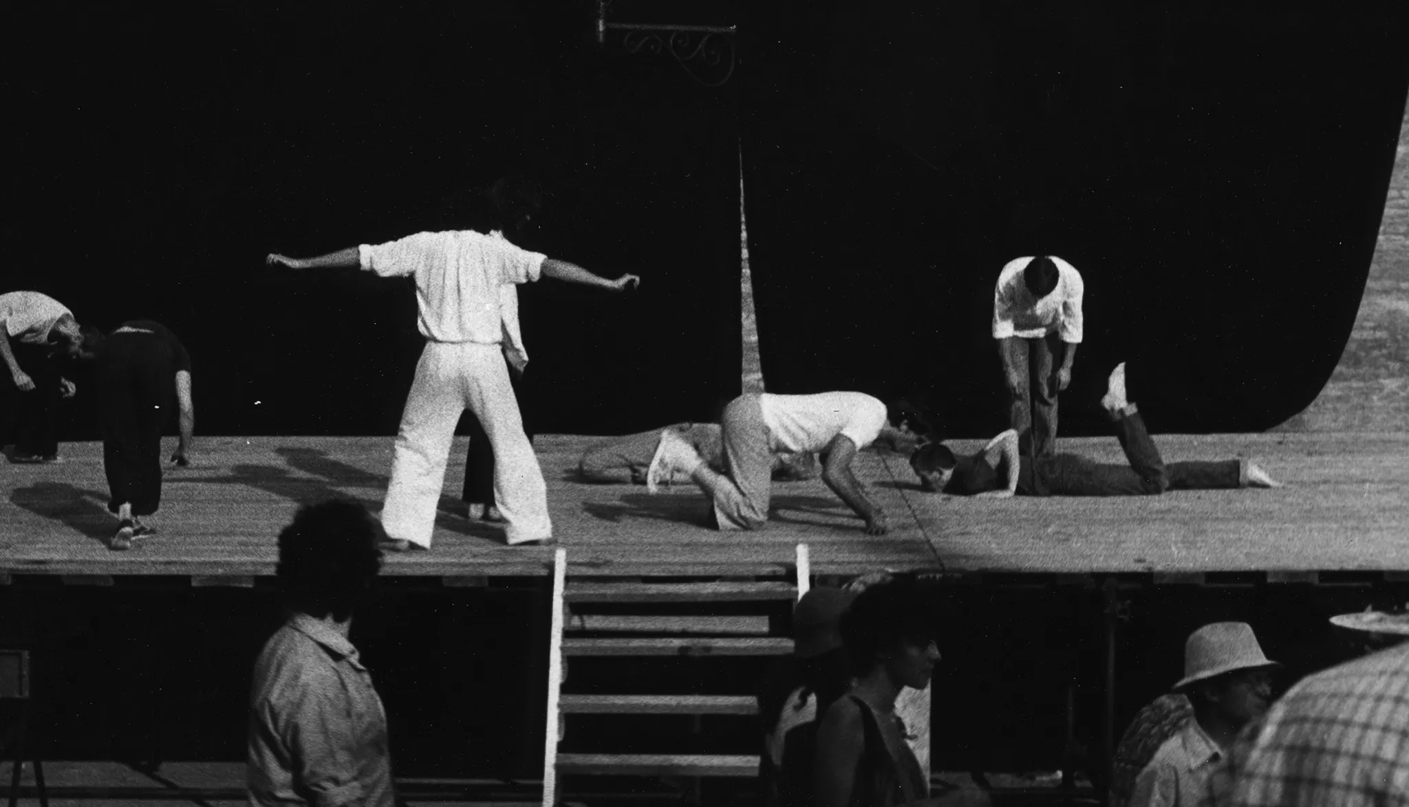 Scena plenerowa. Na pierwszym planie odwróceni plecami widzowie patrzą na scenę. Na scenę prowadzą drewniane schody. Z tyłu sceny ściana z czarnej płachty. Na scenie stoją aktorzy i aktorki w różnych działaniach. Wyglądają, jakby mieli na sobie prywatne ubrania. Wspólnie tworzą choreograficzną kompozycję. Aktorzy i aktorki po bokach sceny są statyczni. Aktorzy w centrum ruszają się dynamicznie. Na dalszym planie, za sceną widać budynki.
