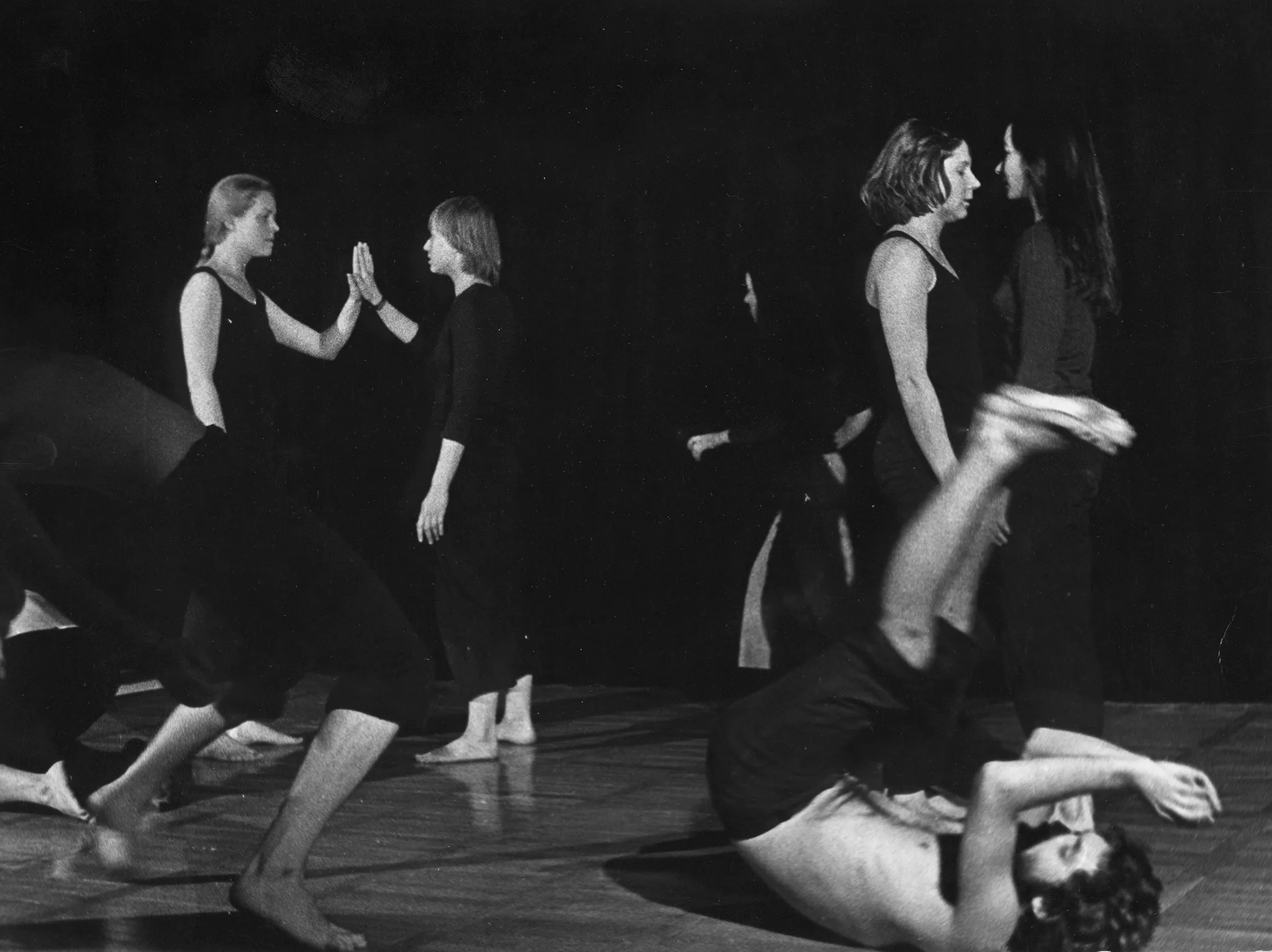 Grupa aktorów i aktorek. Na pierwszym planie dwóch aktorów wykonuje akrobatyczne ruchy na podłodze. Za nimi, w dwóch parach stoją cztery aktorki. W każdej parze aktorki są zwrócone do siebie twarzami. W oddali przechodzi przez scenę słabo widoczny aktor. Aktorzy ubrani są w czarne spodenki, mają nagie torsy. Aktorki ubrane są w czarne spodnie i czarne koszulki. Wszyscy są boso.