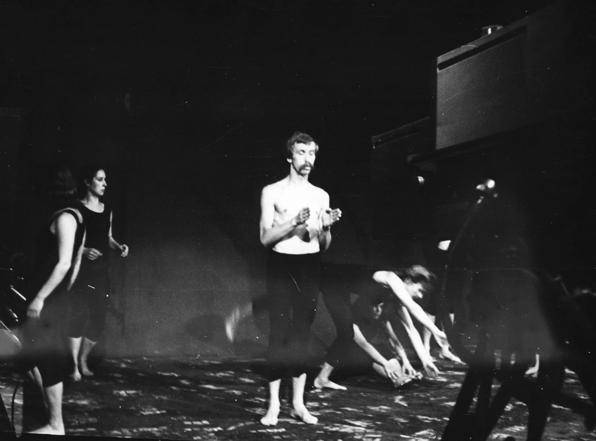 Niewyraźne, rozmazane zdjęcie. Po lewej stoi aktor. Jest ubrany w czarne spodenki, ma nagi tors. Jest boso. Schyla się ku podłodze, jakby się rozciągał. Po prawej stronie stoi i siedzi grupa aktorek. Są ubrane na czarno, są boso.