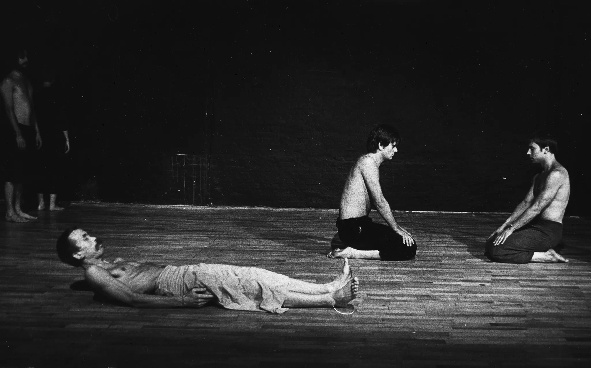 Na plecach leży aktor. Ubrany jest w jasne spodenki, ma nagi tors. Patrzy w sufit. Za nim klęczy dwóch aktorów. Ubrani są w ciemne spodenki, mają nagie torsy. Klęczą naprzeciwko siebie i patrzą na siebie nawzajem. Obaj mają jedną rękę wyciągniętą do boku.