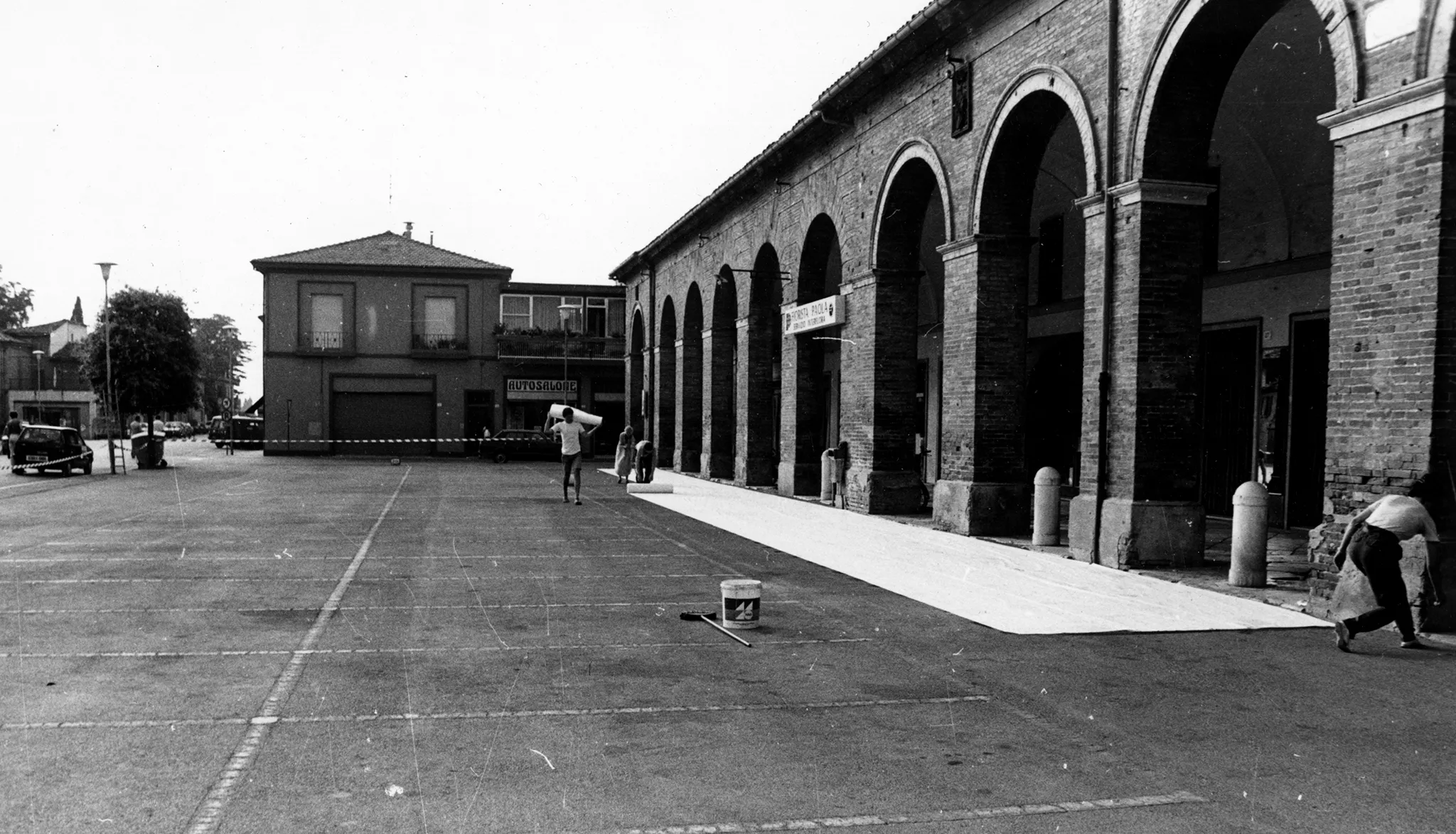 Przestrzeń miejska. Grupa aktorów i aktorek rozwija na ulicy między budynkami wielką biała płachtę. Po lewej stronie przechodzi aktorka z wiadrem i szczotką.