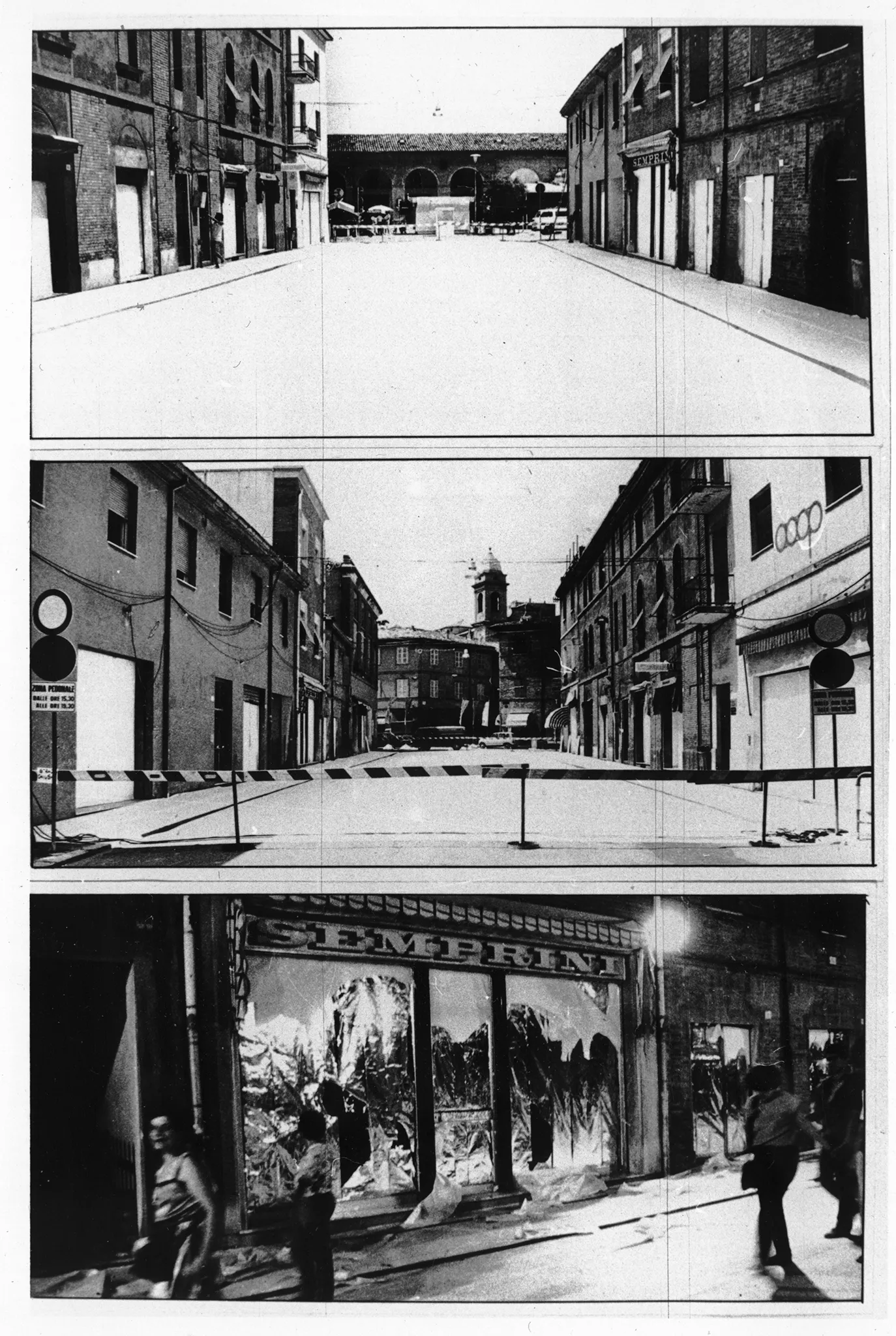 Trzy zdjęcia jedno pod drugim. Zdjęcie na górze przedstawia pustą ulicę między budynkami. Środkowe zdjęcie przedstawia szlaban i zakaz przejścia na ulicy. Zdjęcie na dole przedstawia poszarpaną witrynę sklepową. Na budynku widnieje napis "SEMPRINI".