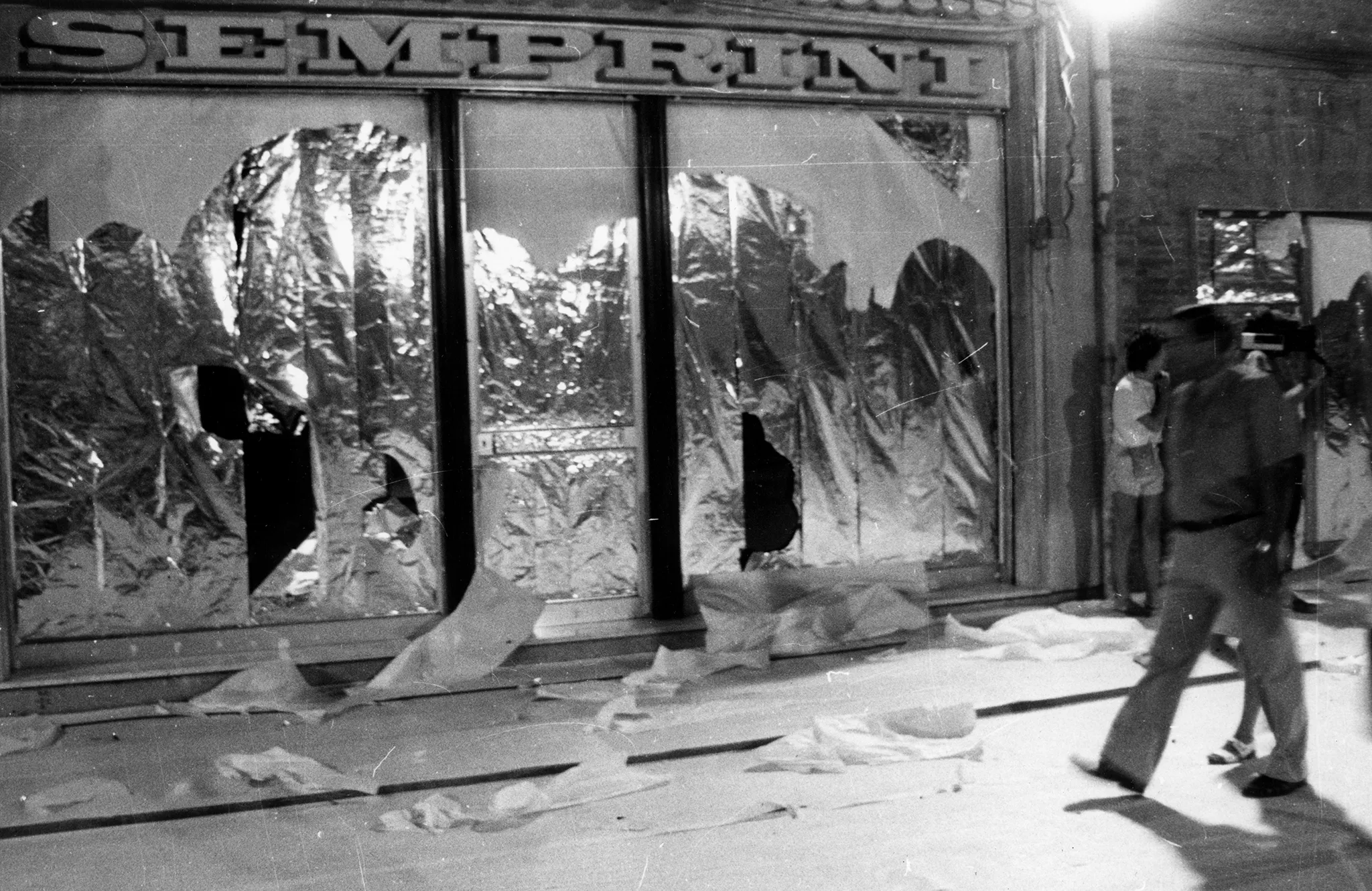 Trzy zdjęcia jedno pod drugim. Zdjęcie na górze przedstawia pustą ulicę między budynkami. Środkowe zdjęcie przedstawia szlaban i zakaz przejścia na ulicy. Zdjęcie na dole przedstawia poszarpaną witrynę sklepową. Na budynku widnieje napis "SEMPRINI".