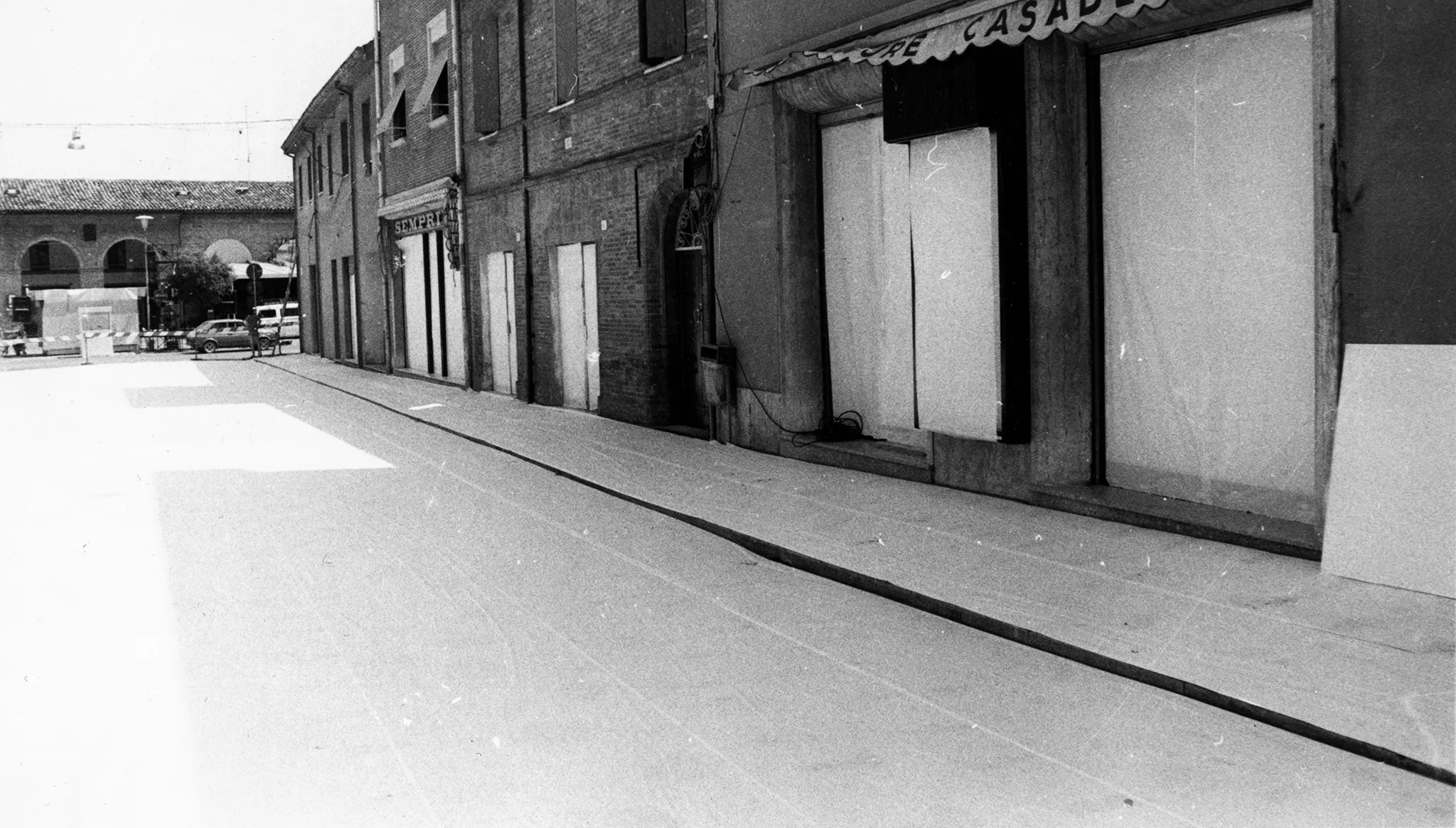 Trzy zdjęcia jedno pod drugim. Zdjęcie na górze przedstawia pustą ulicę między budynkami. Środkowe zdjęcie przedstawia szlaban i zakaz przejścia na ulicy. Zdjęcie na dole przedstawia poszarpaną witrynę sklepową. Na budynku widnieje napis "SEMPRINI".