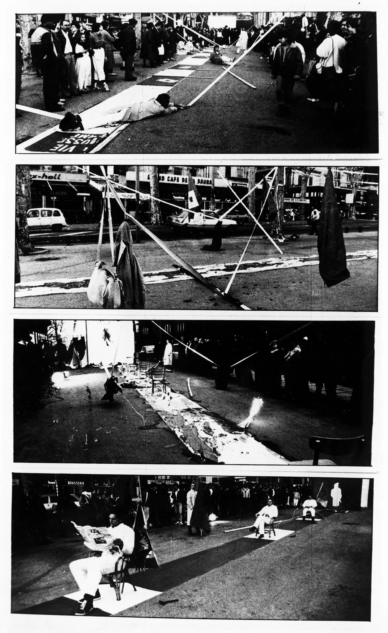 Cztery zdjęcia jedno pod drugim. Wszystkie przedstawiają przestrzeń miejska i wybieg rozwinięty na środku ulicy. Na zdjęciu na górze na wybiegu leżą aktorzy. Po obu stronach wybiegu stoją widzowie. Na drugim zdjęciu od góry wybieg jest brudny. Nad wybiegiem wiszą linki, na których wiszą ubrania i fragmenty materiałów. W tle widać budynki, samochody i przechodniów. Na trzecim zdjęciu od góry na wybiegu stoją krzesła. W niektórych miejsach wybieg jest podpalony. Na zdjęciu na dole na wybiegu stoją krzesła. Na krzesłach siedzą aktorzy czytający gazetę. Obok wybiegu stoi grupa widzów.
