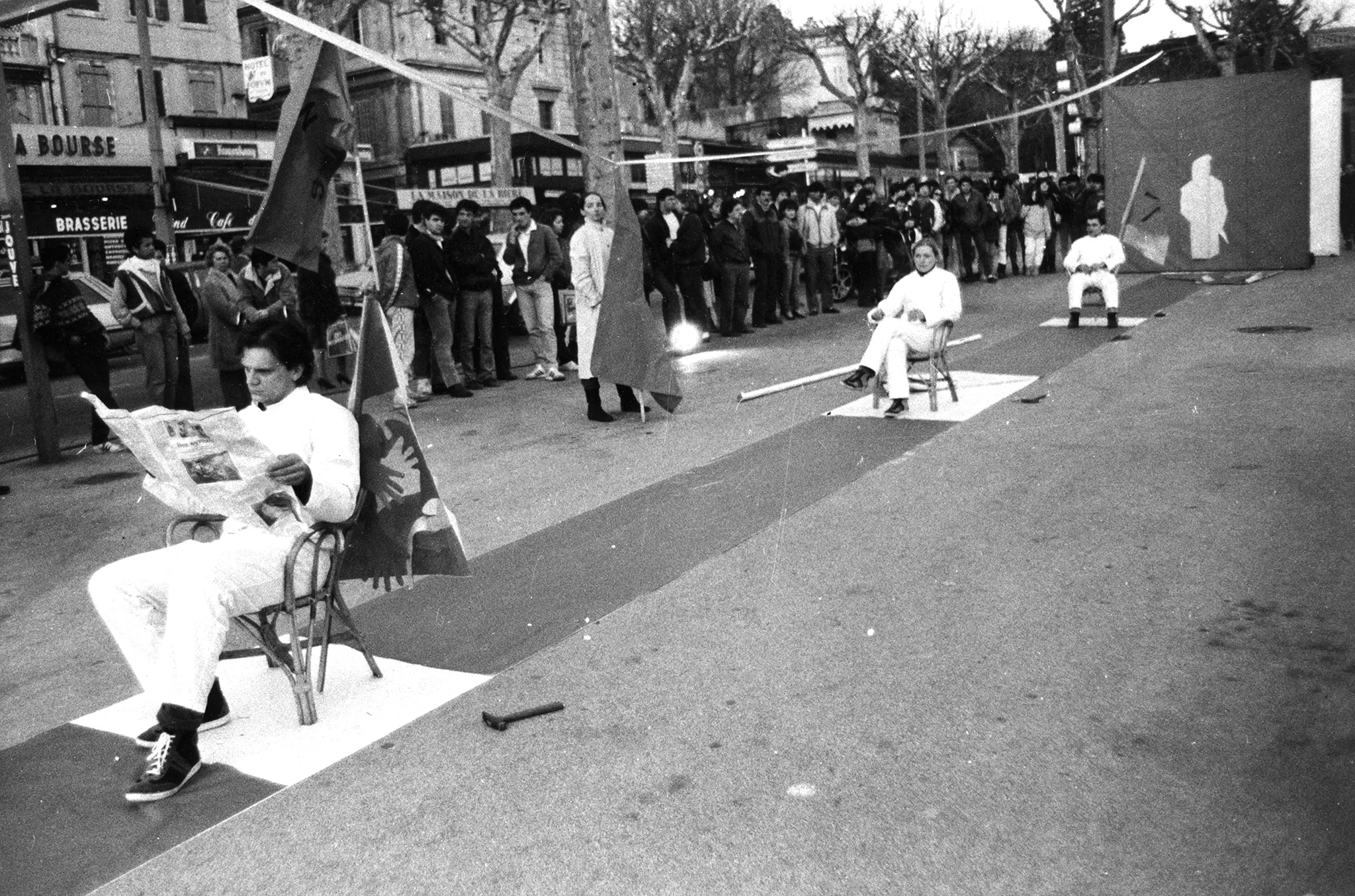 Przestrzeń miejska. Na środku ulicy rozwinięty wybieg. Na wybiegu siedzi czteroosobowa grupa aktorów i aktorek ustawionych jedno za drugim w dużej odległości. Ubrani są na biało. Przyklejają do wybiegu białe napisy. Po dwóch stronach stoi przyglądająca im się grupa widzów. W tle widać drzewa, budynki i samochody.