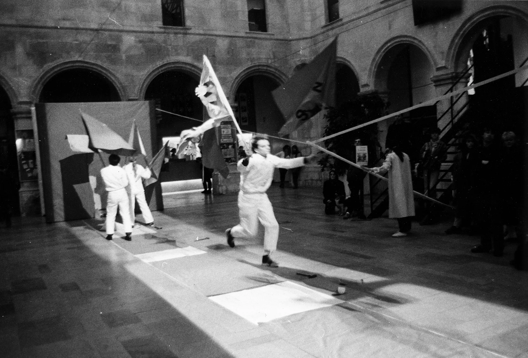Przestrzeń miejska. Na środku ulicy rozwinięty wybieg. Na wybiegu siedzi czteroosobowa grupa aktorów i aktorek ustawionych jedno za drugim w dużej odległości. Ubrani są na biało. Przyklejają do wybiegu białe napisy. Po dwóch stronach stoi przyglądająca im się grupa widzów. W tle widać drzewa, budynki i samochody.