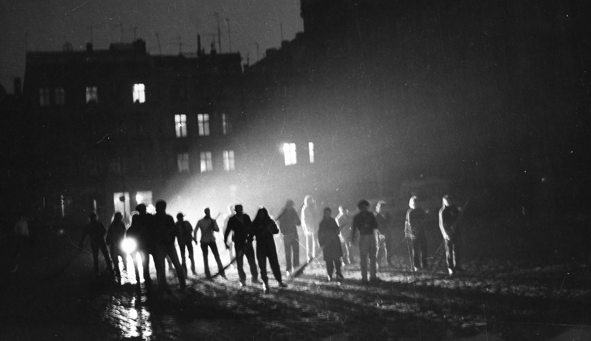 Niewyraźne zdjęcie. Przestrzeń miejska. Między blokami stoi grupa aktorów i aktorek. W rękach trzymają coś, co przypomina miotły. Za ich plecami leżą reflektory, które oświetlają przestrzeń.
