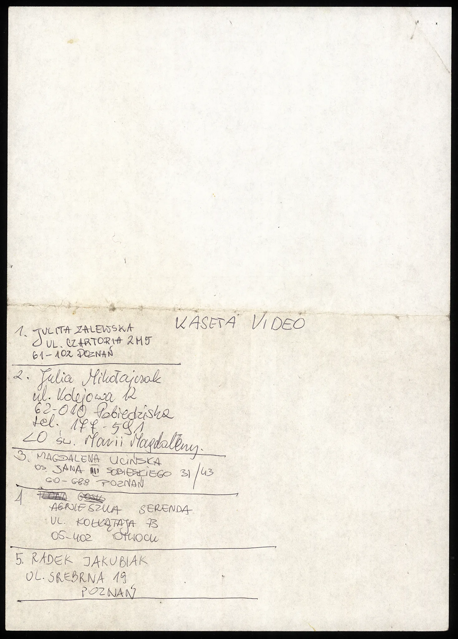 akcja Tango wodne (1994) Tango wodne → Tango wodne – opis opis, kolor 1994 Tango wodne → Tango wodne – zapowiedź na Festiwal “Malta” w Poznaniu (1994) opis, cz/b 1994 Tango wodne → Tango wodne – notatki reżyserskie notatki reżyserskie, cz/b 1994 Tango wodne → Tango wodne – lista stażystów inne, kolor 1994 inne Tango wodne – lista stażystów date 1994 format color kolor visible persons location copyright running time description
